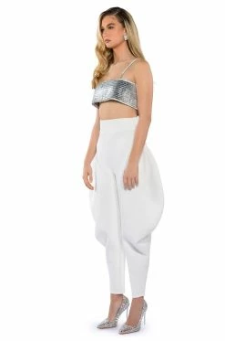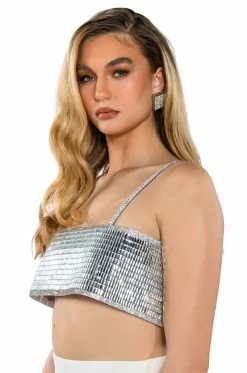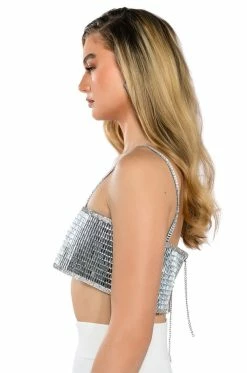 You belong on the dancefloor in The AKIRA Label Disco Ball Mirror Bralette in Silver. This glamorous piece features a polyester base, glimmering square cut gemstone detailing, rhinestone trim, and slim flexible plastic tank straps. Complete with a bandeau-like cropped cut, a straight-across neckline, adjustable chain link back straps, lobster claw clasp closures, and a smooth inner lining. Pair this piece distressed denim for an elevated yet casual look.