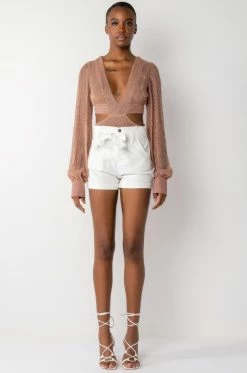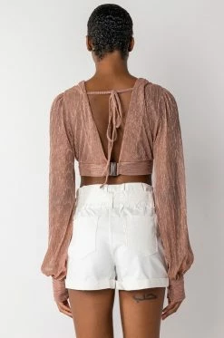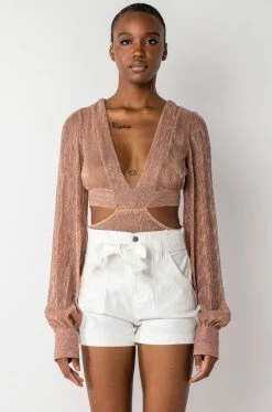 You should be dancing in The AKIRA Label Disco Diva Deep V Long Sleeve Bodysuit With Cutouts. This sheer yet sparkly pleated accordion piece features a plunging neckline, long blouson sleeves, cut out back, a back clasp closure, and a tie back shoulder strap. Complete with an elastic waist, an attached thong bottom, and a snap gusset closure. Pairs perfectly with palazzo pants and platform sandals.