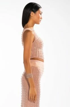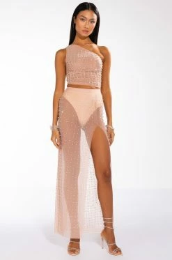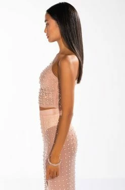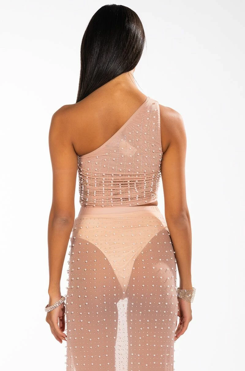 The AKIRA Label Disco Doll Embellished One Shoulder Mesh Crop Top is made from a sheer mesh fabrication and features a one shoulder neckline, iridescent rhinestone and pearl embellishments, ruched side detailing, and a cropped silhouette. Pair this glimmering piece with the coordinating AKIRA Label Disco Doll Embellished High Slit Mesh Maxi Skirt to finish off your dance floor-worthy look!