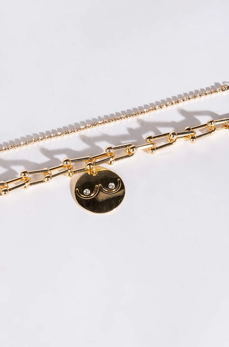 Embrace the goddess within in The AKIRA Label Divine Feminine Bracelet! This bracelet set features two separate faux gold link bracelets: one is a thin rhinestone link bracelet while the other is a barbell link bracelet with an embossed chest design coin charm with rhinestone detailing. Both bracelets are complete with adjustable lobster claw fastenings.