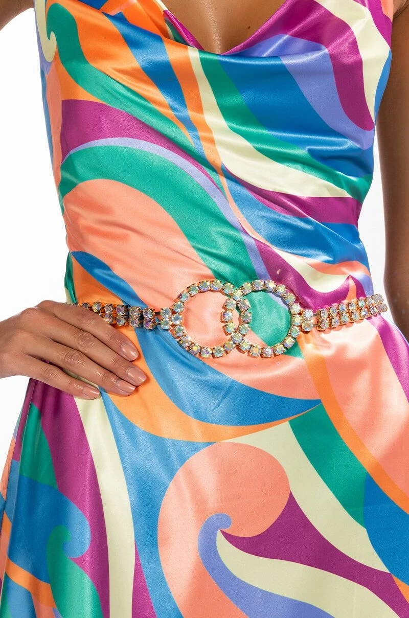 The sweet life starts with The AKIRA Label Dolce Rhinestone Chain Belt. This rhinestone link accessory features a faux gold metallic base, sparkling AB rhinestones, an interlocking circular accent, and an adjustable lobster claw closure.