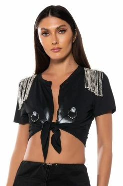 The AKIRA Label Double Take Embellished T Shirt In Black is made from a stretchy, lightweight base fabric and features an open front crew neck, short sleeves, and a nude graphic print design with silver ring detail. Complete with rhinestone fringe embellishments on the shoulders, a cropped silhouette, and a front self-tie closure. Style with wide leg denim and cowboy boots for an extra edge to your look.