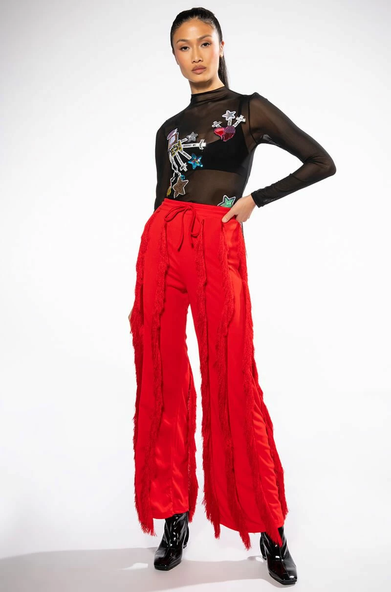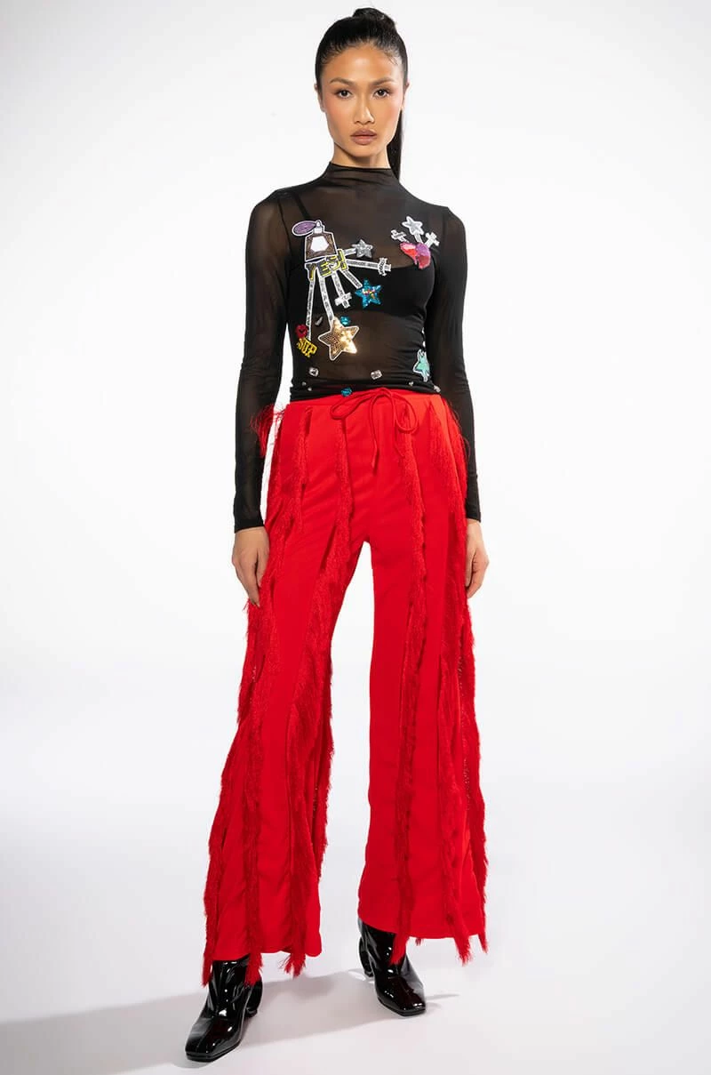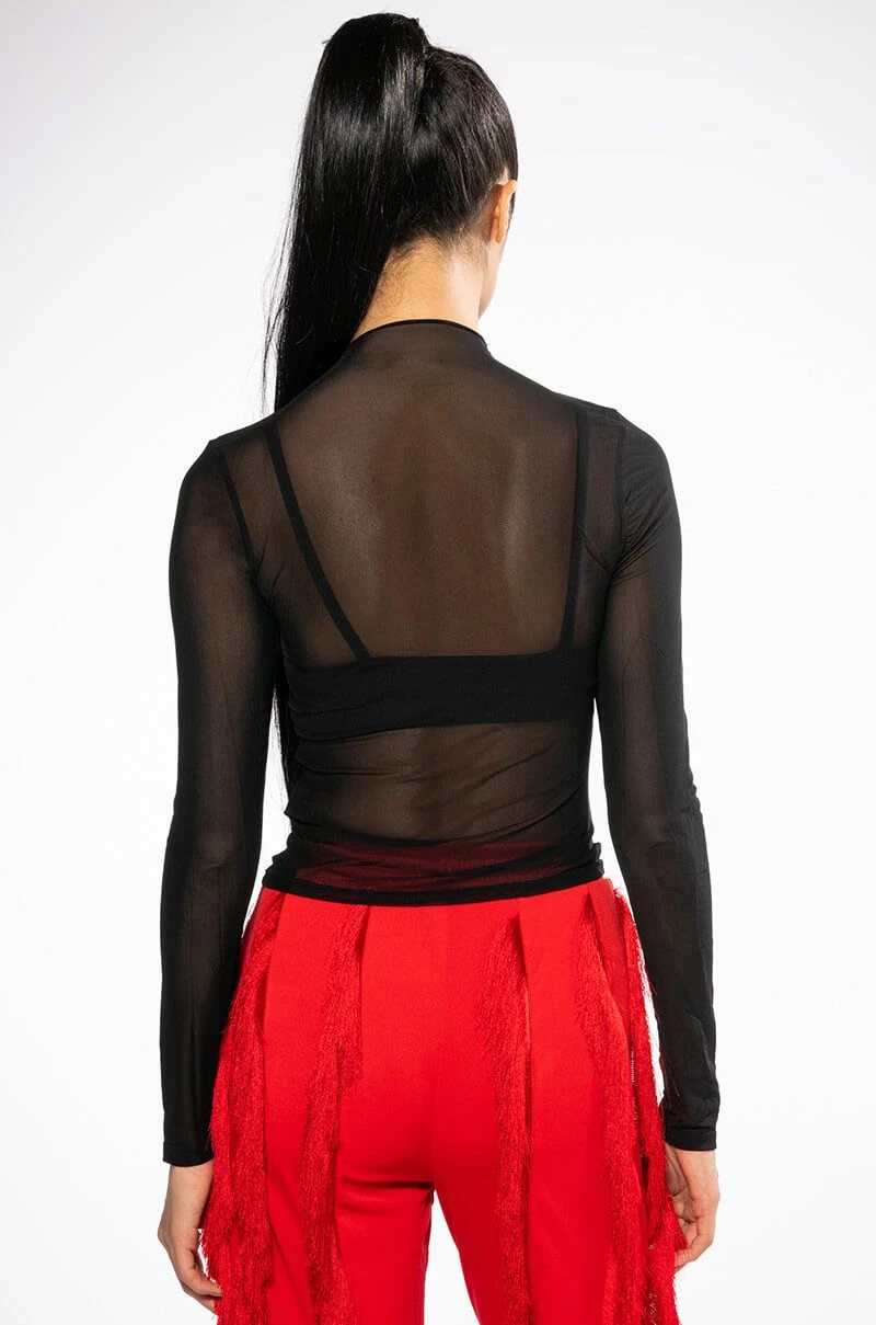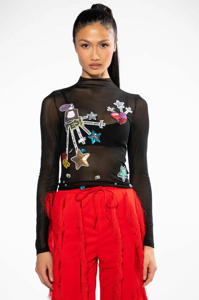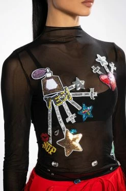 The AKIRA Label Dream Chaser Long Sleeve Mesh Top is made from a sheer mesh fabrication and features a funnel neckline, long sleeves, sequin-detailed patches, scattered gemstone embellishments, and a cropped silhouette.