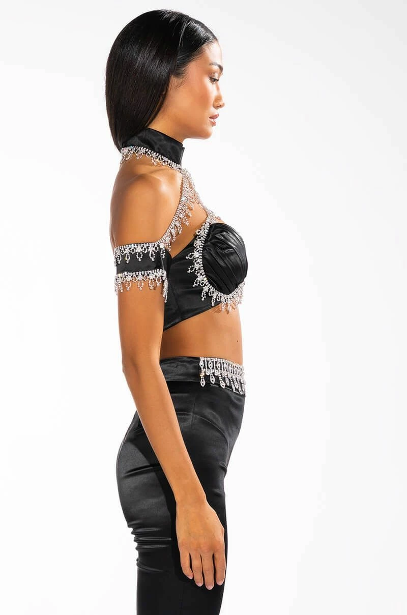 The AKIRA Label Drenched In Diamonds Satin Bra Top is made from a luxe satin fabrication and features a hook and eye back mock neckline with opulent rhinestone chain trim connected to a rhinestone-trimmed off the shoulder crop top with plunging, pleated, padded cups and an exposed back zipper closure. Pair this piece with the coordinating AKIRA Label Drenched In Diamonds Satin Pant to complete your look!