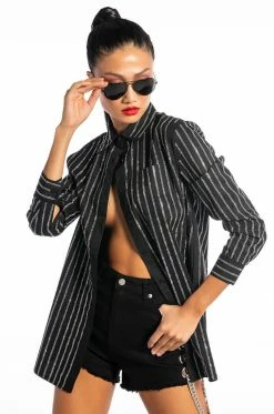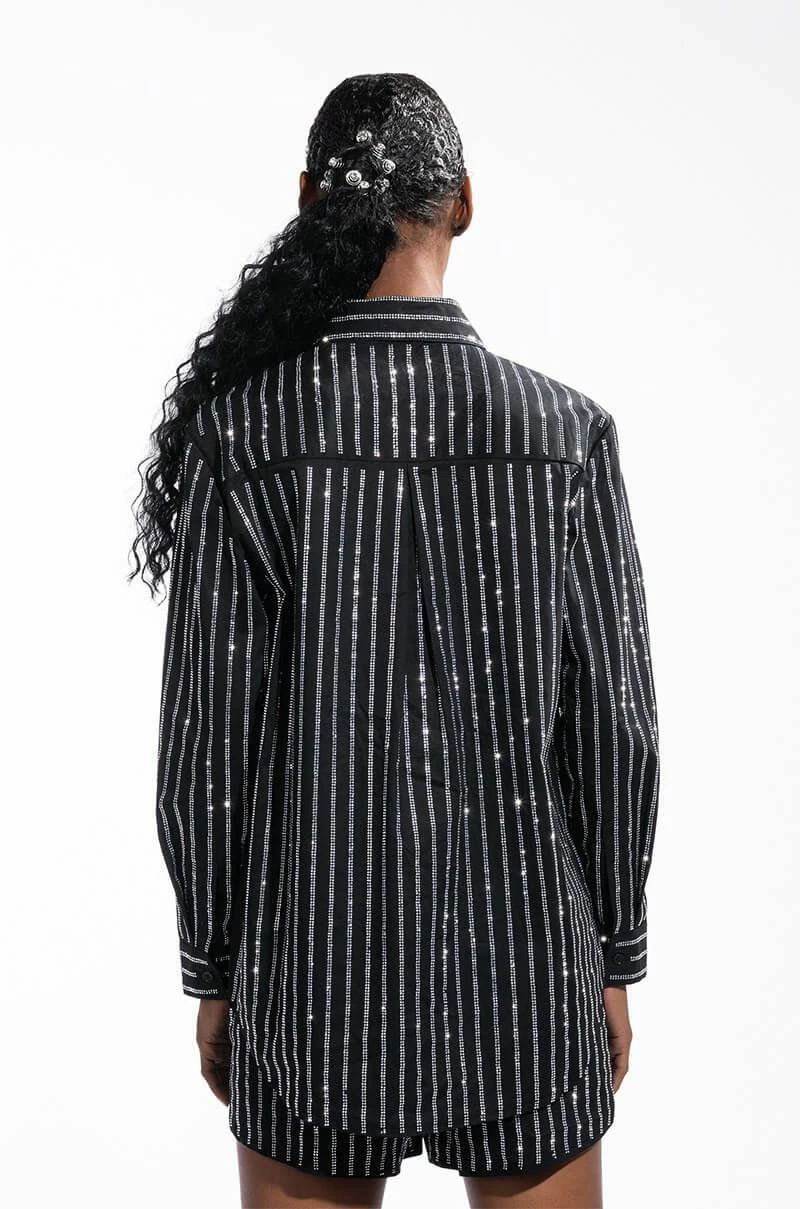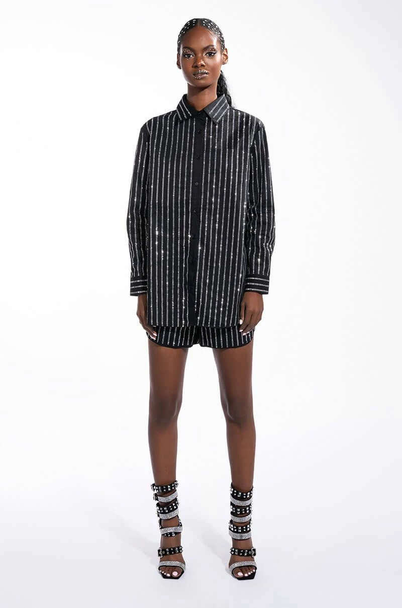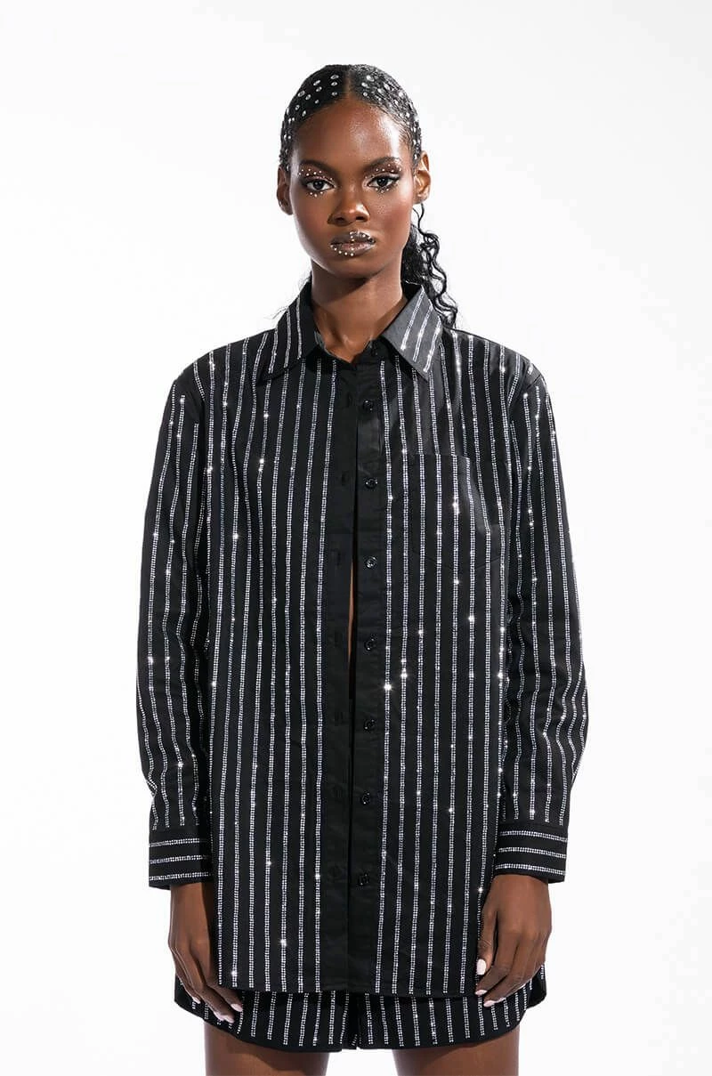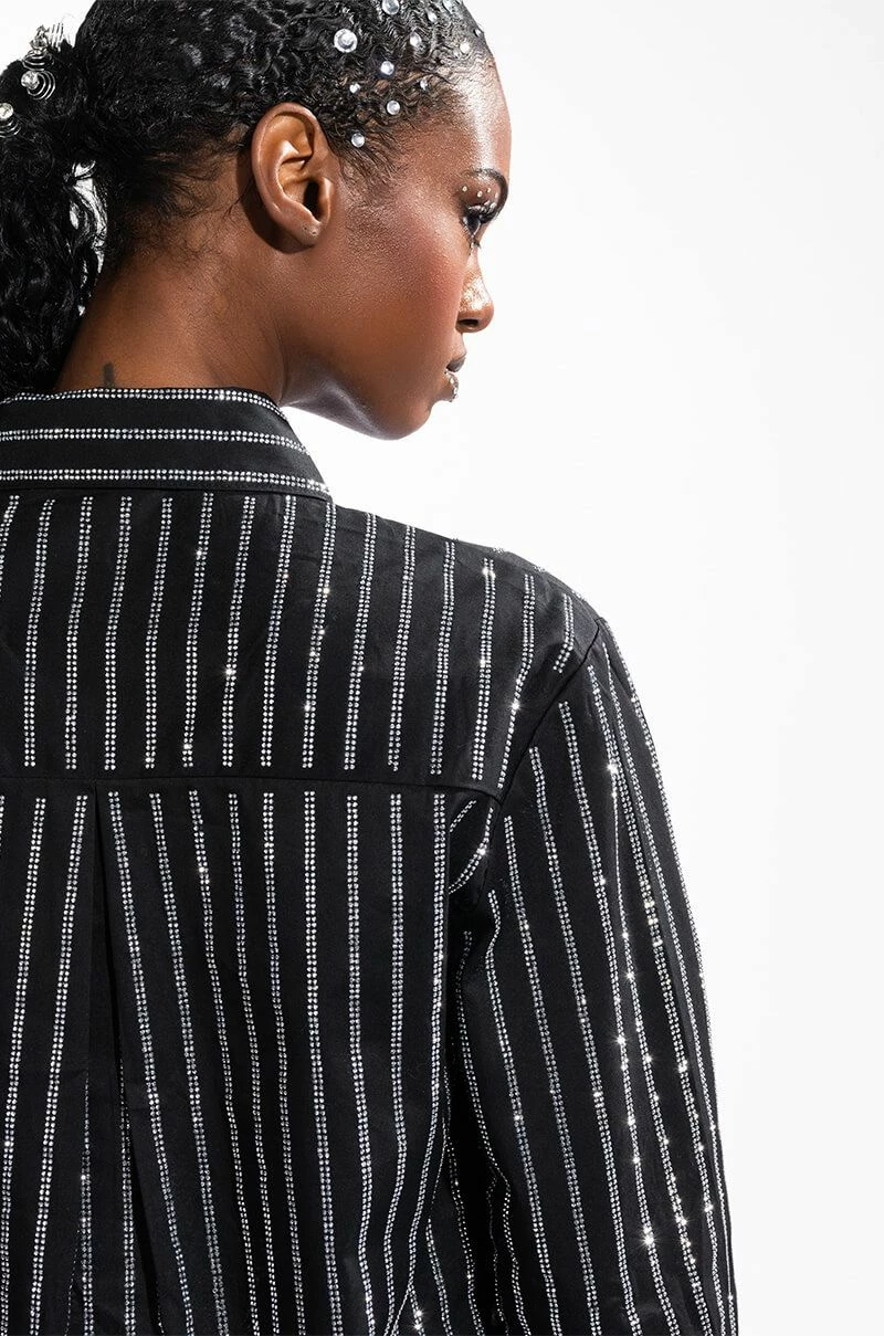 The AKIRA Label Drippin Rhinestone Pinstripe Button Up is made from a light cotton blend fabrication and features a collared neckline, rhinestone pinstripes, long sleeves with button wrist details, a rounded hem, and a button up front closure. Pair this piece with the matching AKIRA Label Drippin Rhinestone Pinstripe Short to complete your blinged-out look!