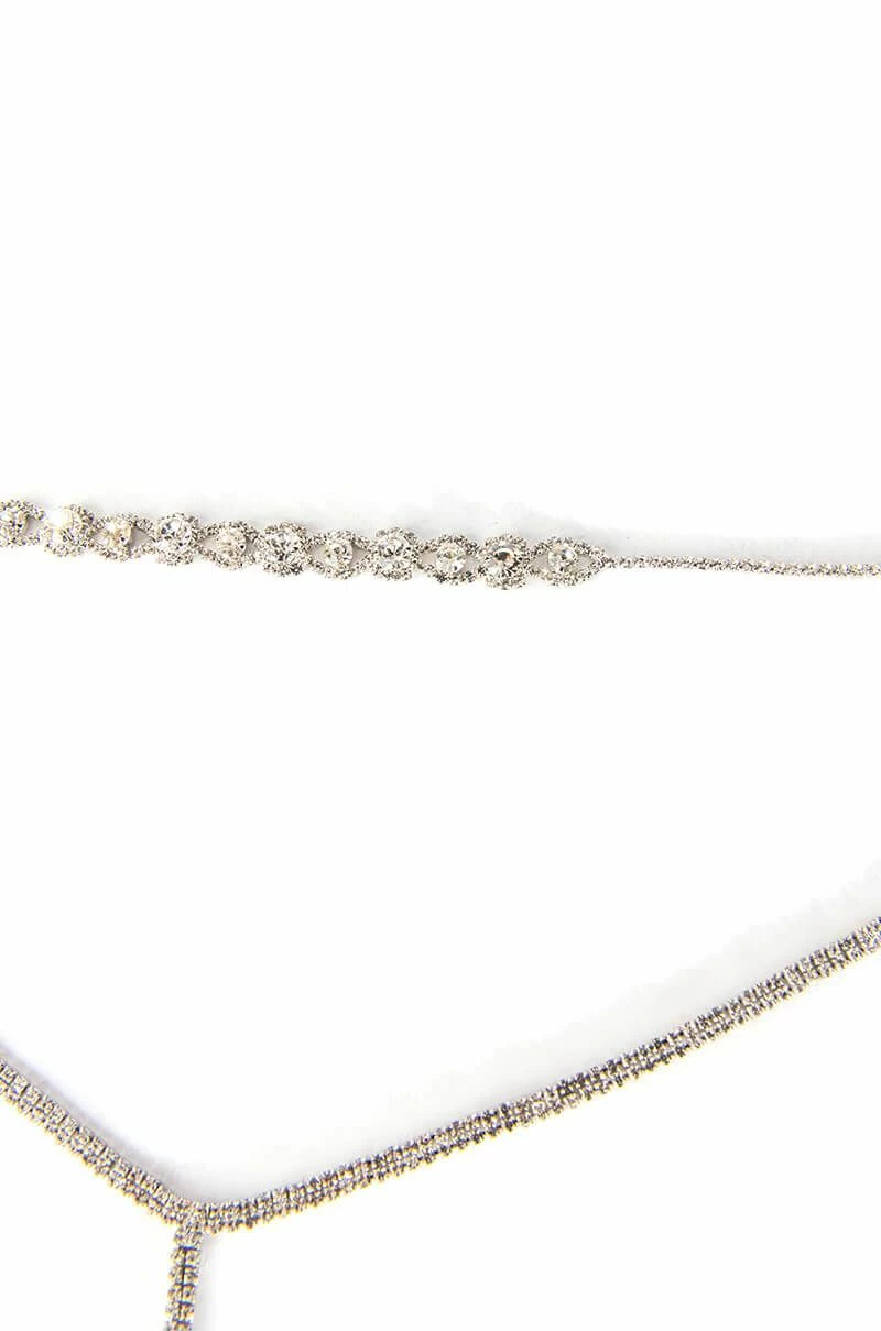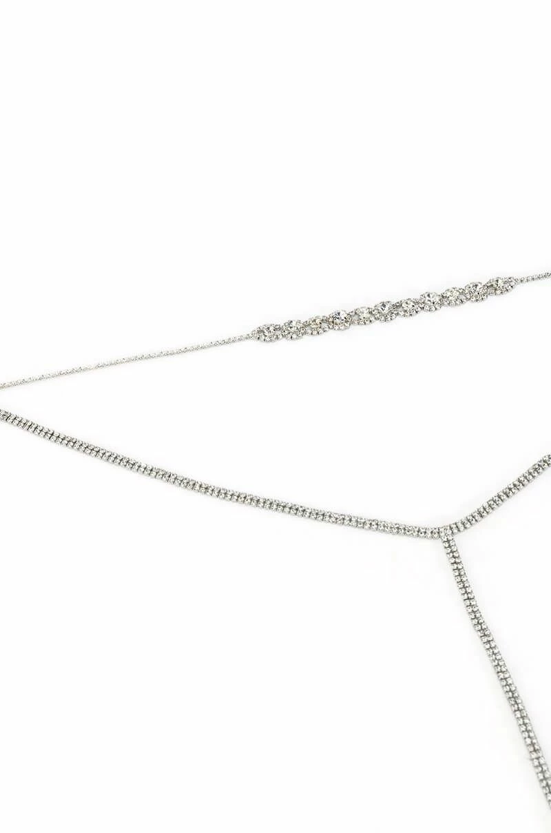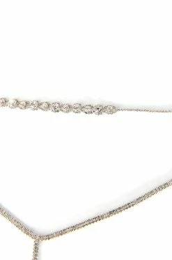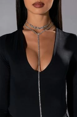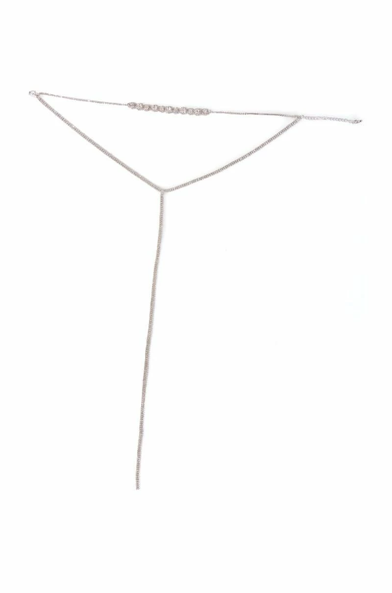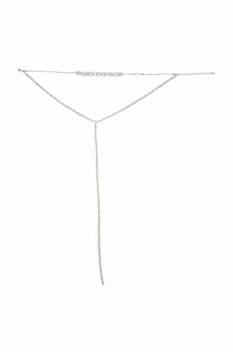 The AKIRA Label Duchess Rhinestone Lariat Choker Necklace is made from a faux silver metal base and features an ornate rhinestone choker connected to an extended rhinestone link lariat. Complete with an adjustable lobster claw closure.