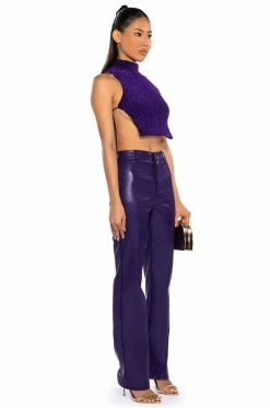 The AKIRA Label Echo Velvet Sleeveless Top in Purple features a textured velvet fabrication, a mock neckline, a sleeveless silhouette, sexy open tie-up sides, a nylon inner lining, and a cropped cut. Complete your look with pleather leggings and chunky booties.
