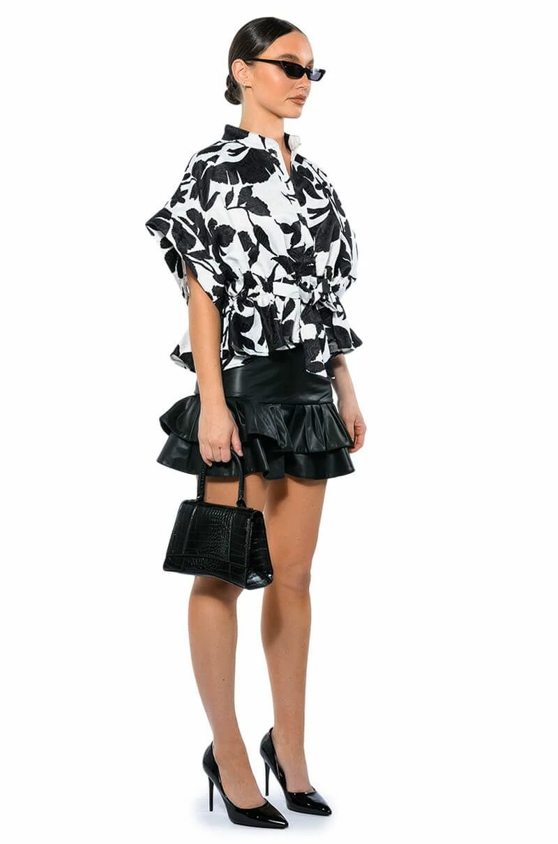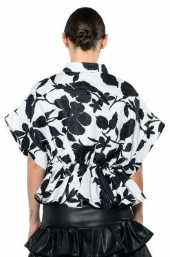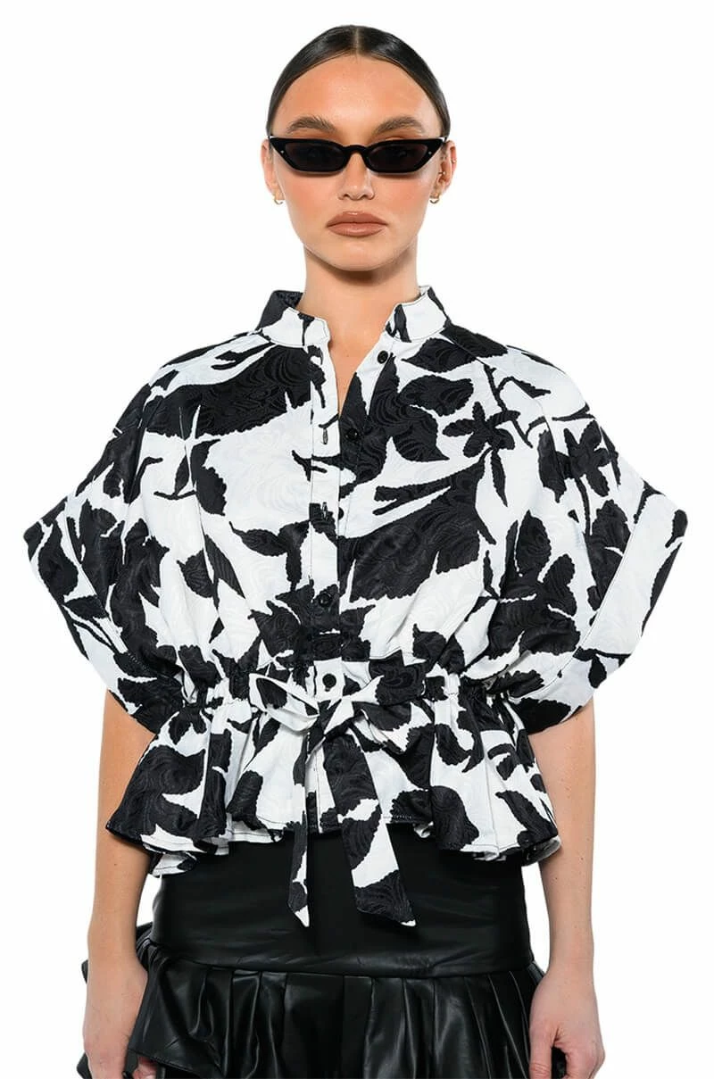 The AKIRA Label Eleganza Tie Front Blouse features a floral brocade base, a Mandarin collar, short cap sleeves, and a button down front closure. Complete with a tie front waistline and a cropped, peplum hem. Pairs perfectly with a cute trench, high waisted denim and knee high boots.
