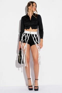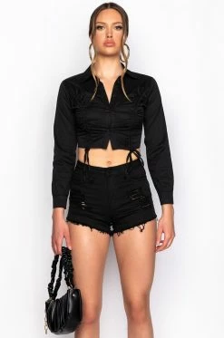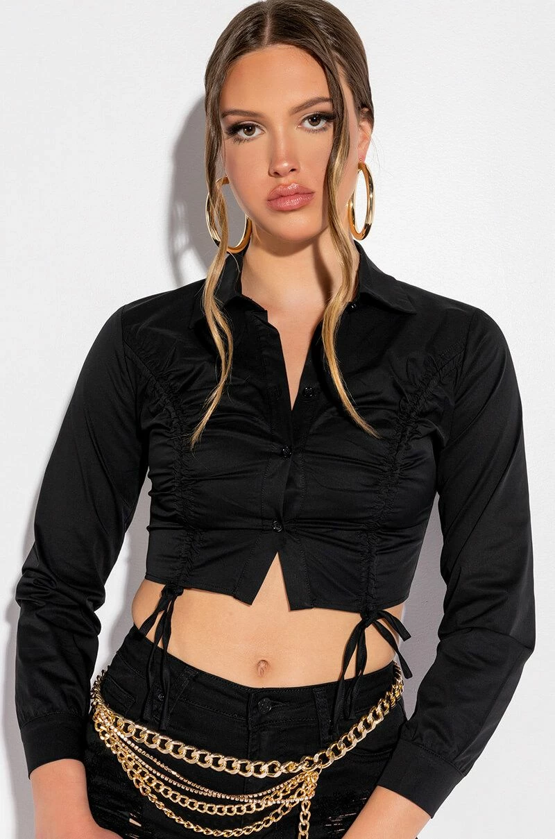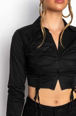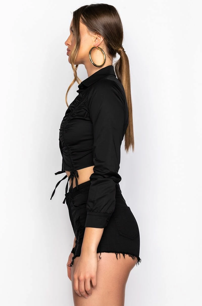 The AKIRA Label Elena Ruched Puff Sleeve Blouse is made from a classic blouse fabrication, and is complete with ruched drawstring detailing along the front, a cropped length, long sleeves, a collared neckline, and a front button up closure.