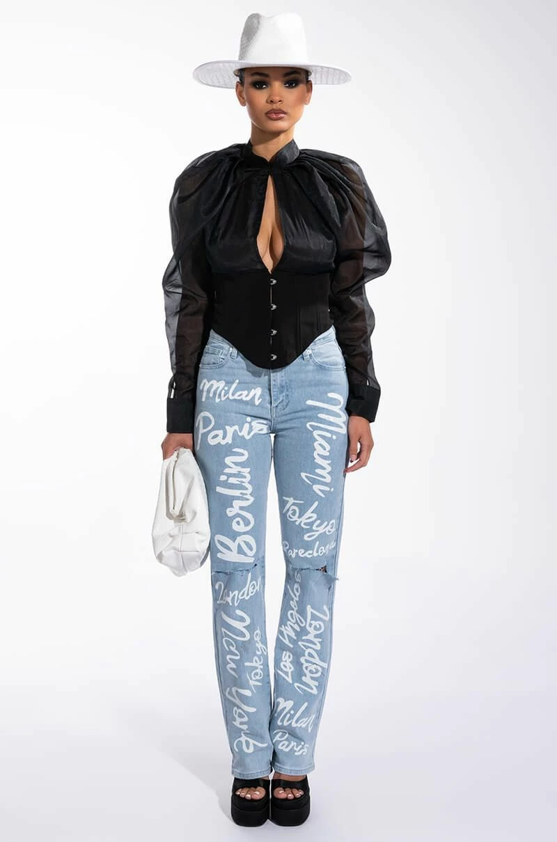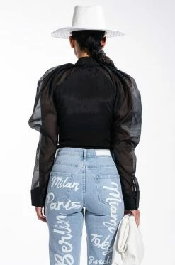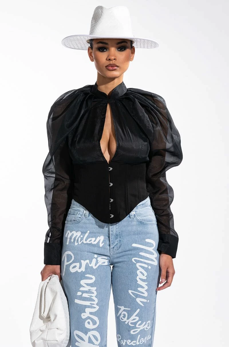 The AKIRA label Envious Cutout Long Sleeve Corset Blouse is made from a sheer fabrication and features a standing collar with a hook and eye enclosure, pleated shoulder detailing, long cuffed sleeves with buttoned wrists, princess seam detailing, a corset bodice, boning for structure, and front metal hook and eye closures.