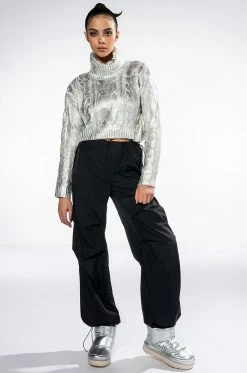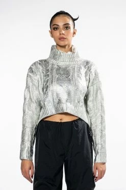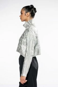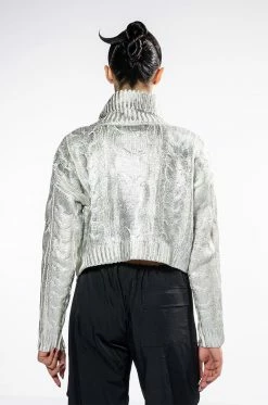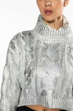 The AKIRA Label Esme Silver Metallic Sweater features a cable knit fabrication, a fold over turtleneck collar, long sleeves, a cropped cut, and ribbed knit hems. Complete with silver metallic acrylic overlay detailing. Pair this piece with pleather leggings and sock booties for an elevated yet cozy look.