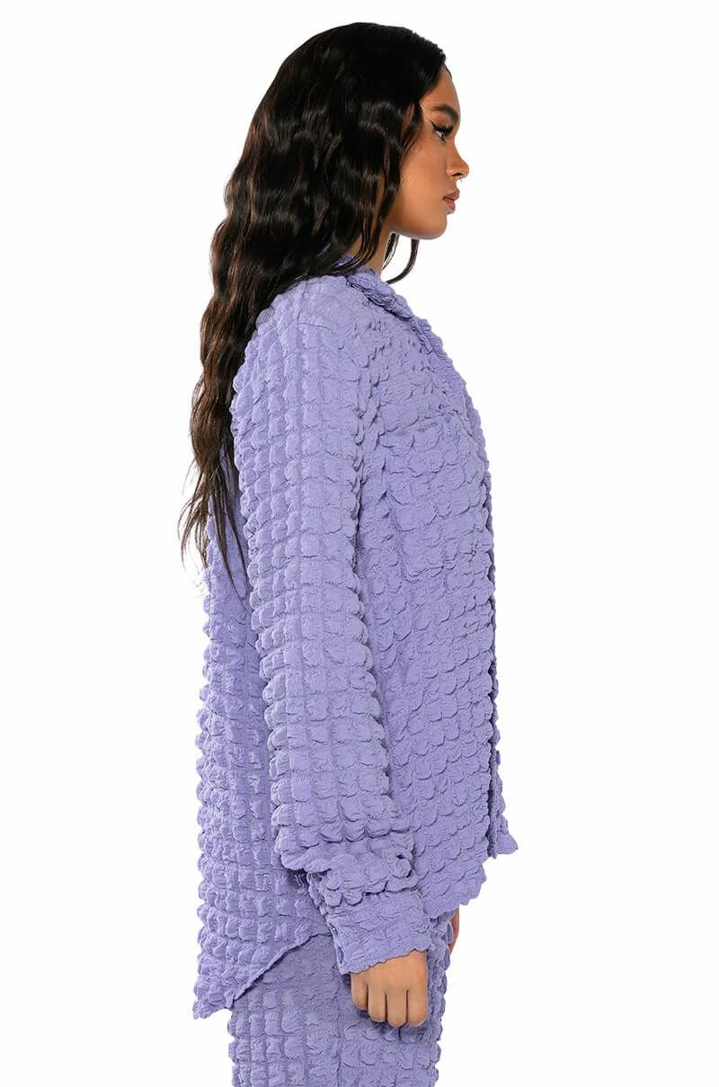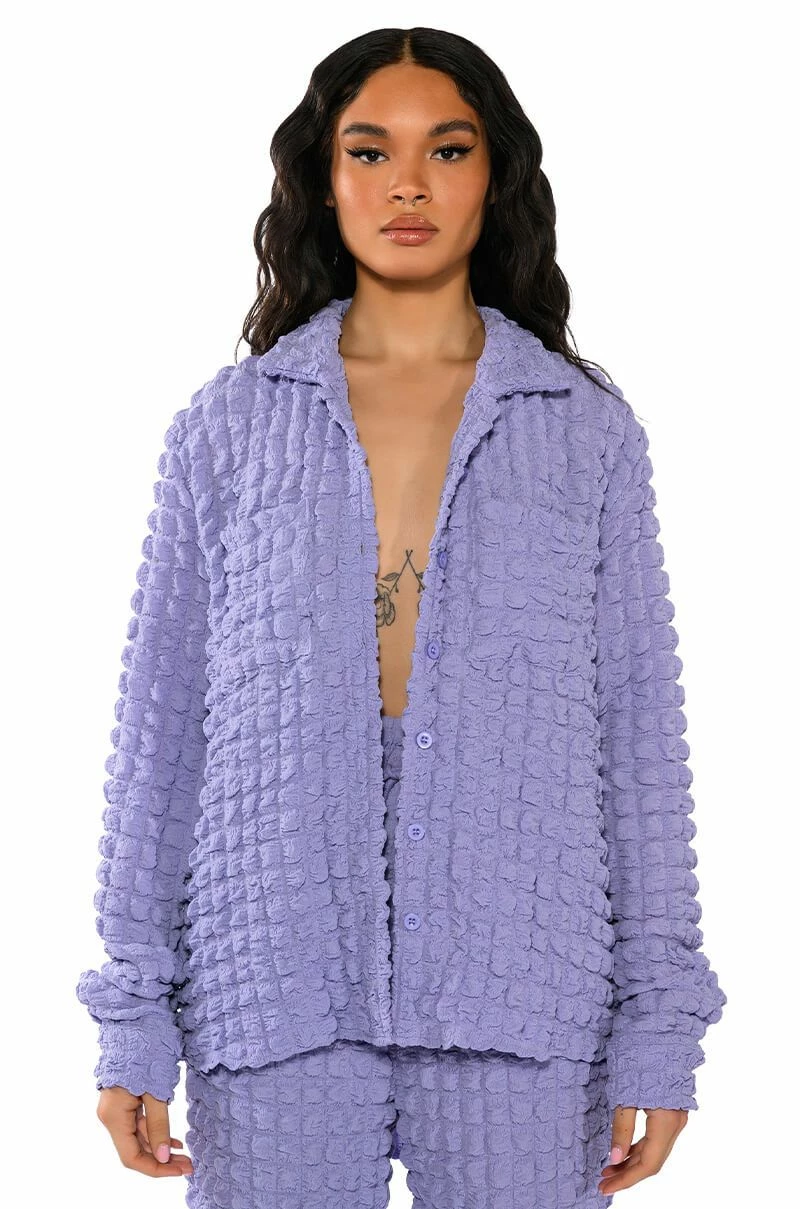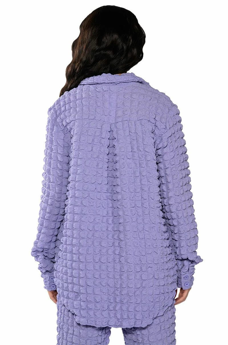 Live out loud with The AKIRA Label Existing Loudly Textured Button Down Top. This piece features an unlined popcorn textured fabrication, a foldover collar, long sleeves with buttoned cuffs at the wrist, and an oversized silhouette. Complete with double front pockets, rounded hems, and a button down front closure. Style this top with fur boots and the coordinating AKIRA Label Existing Loudly Textured Jogger for a cozy, effortless look!
