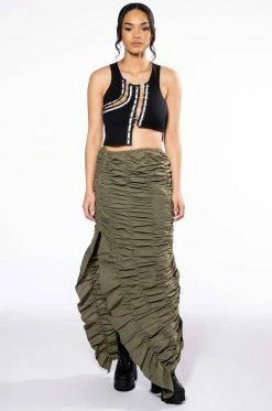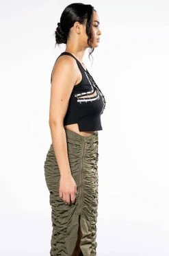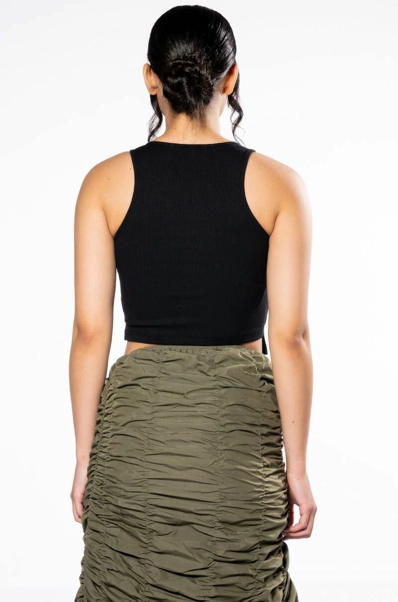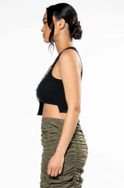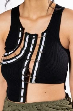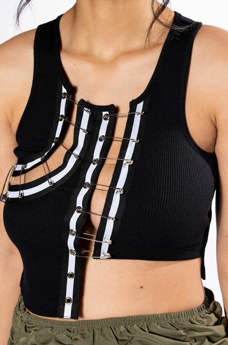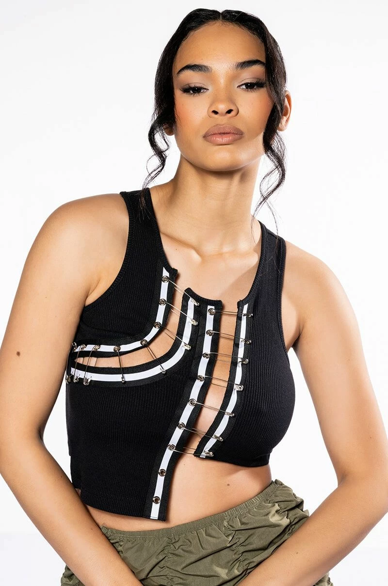 The AKIRA Label Expensive Taste Pin Detail Top is a stretchy ribbed knit tank featuring a sleeveless silhouette and an asymmetrical cropped cut. Complete with cut out front detailing, r-ring accents, safety pin closures, and striped ribbon trim.