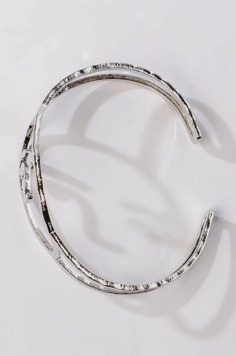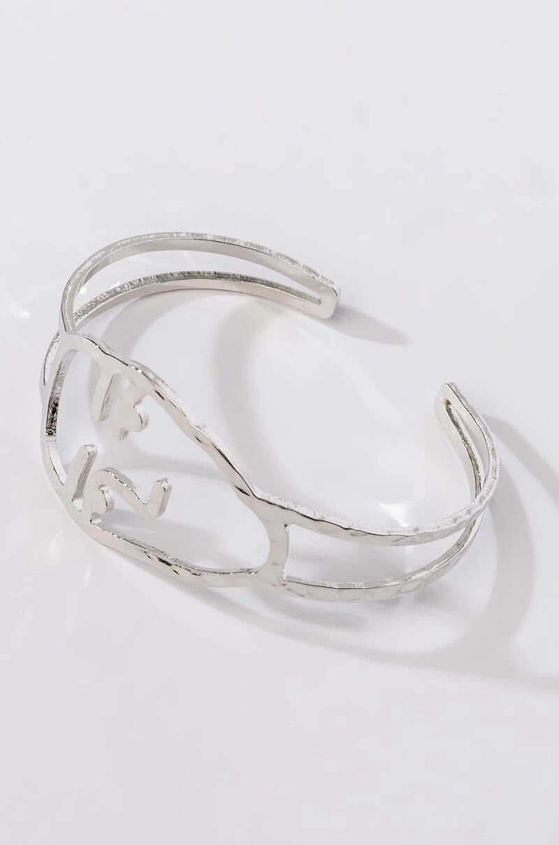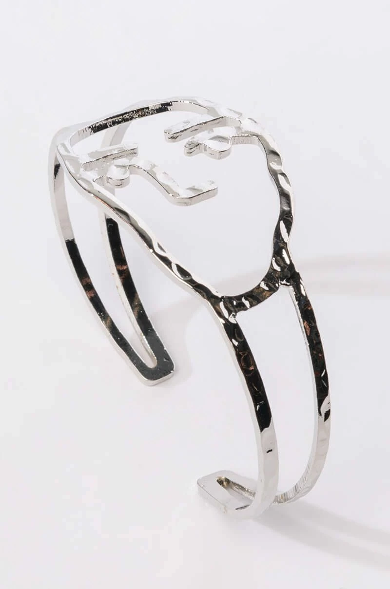 The AKIRA Label Face It Bracelet Cuff is made from a hammered faux metal base and features an abstract silhouette of a face in a slip-on cuff bracelet design with an open back.
