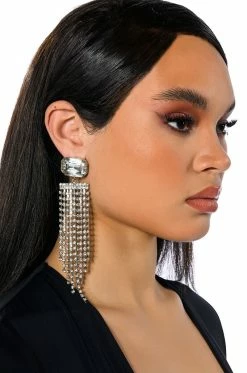 The AKIRA Label Falling Waters Embellished Chandelier Earrings are made from a faux silver metal base and feature a chandelier silhouette with a gem lobe post and a cascading rhinestone fringe drop accent. Complete with post back fastenings.