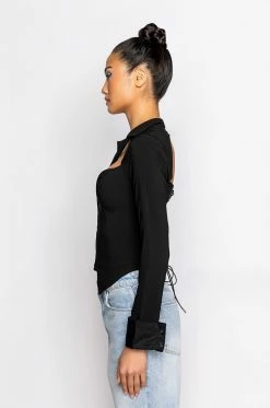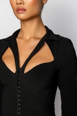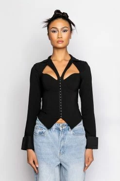 The AKIRA Label Fan Behavior Cutout Long Sleeve Corset Blouse is made from a structured blazer fabrication and features a notch collar, padded shoulders, a corset bodice, cuffed long sleeves with button wrist details, a sexy chest cutout, padded cups, princess seam detailing, a back cutout, a back lace up enclosure, and front hook and eye closures.
