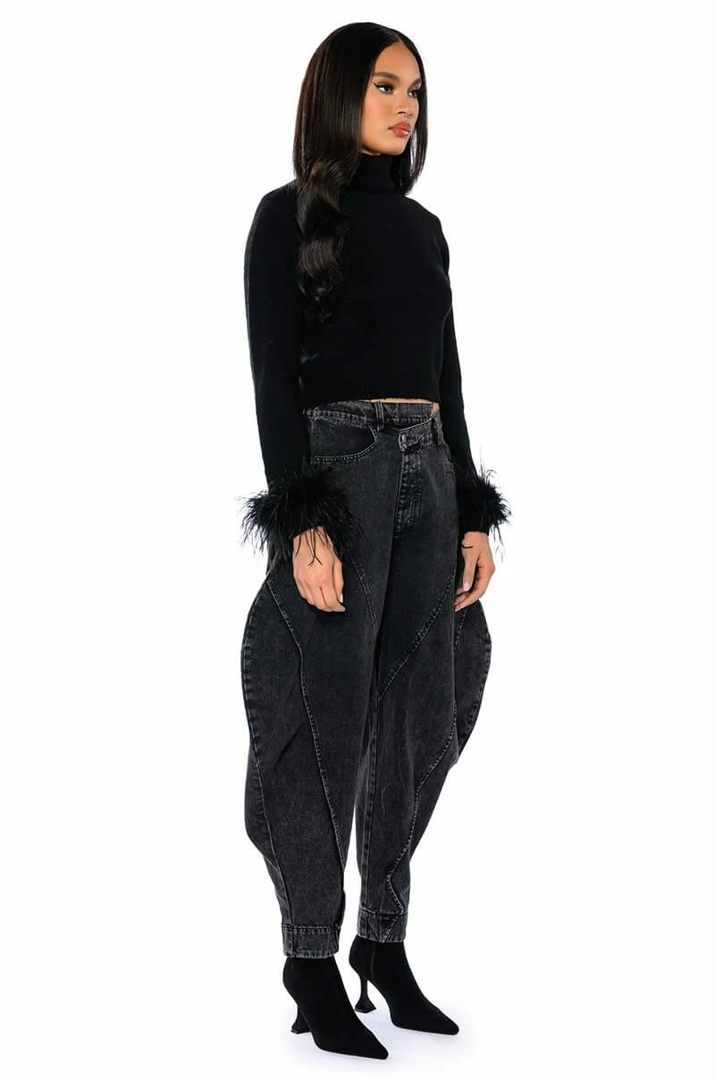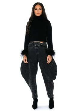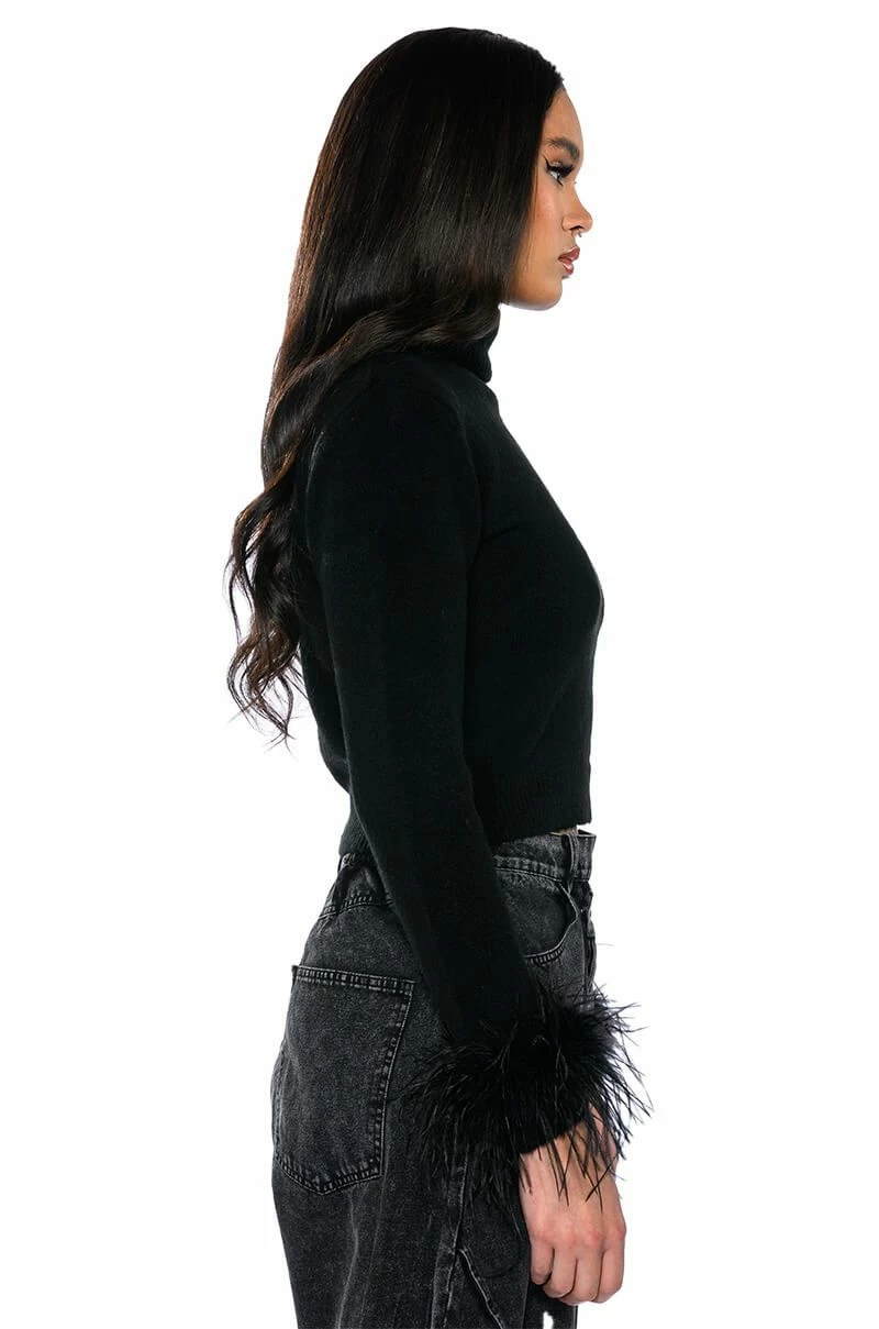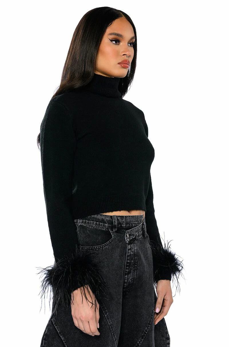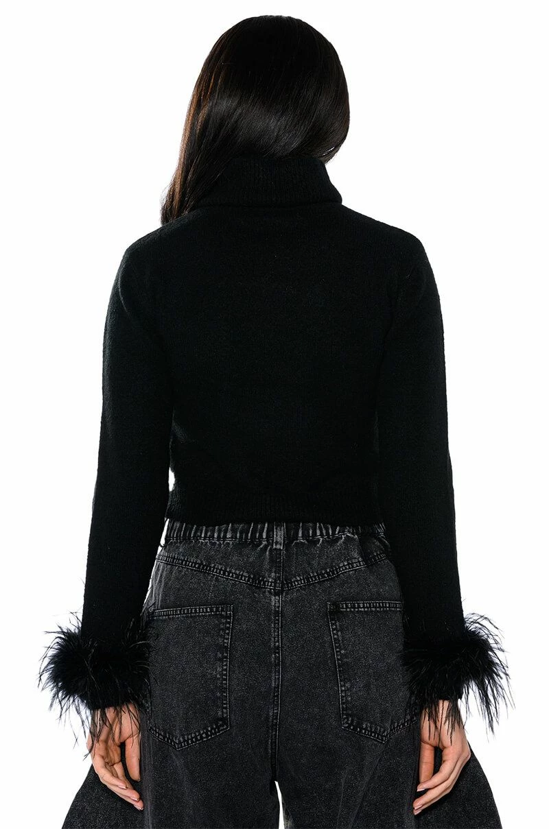 Bougie vibes only. The AKIRA Label Fancy Huh Feather Cuff Turtleneck Sweater is made from a stretch knit base fabrication and features a foldover turtleneck, long sleeves with opulent feather trim, and a ribbed elastic bottom hem. Complete with a cropped silhouette. Dress it up with a matching mini skirt and knee high boots, or with relaxed wide leg pants and heeled booties.
