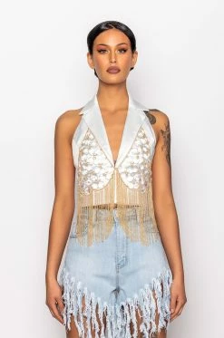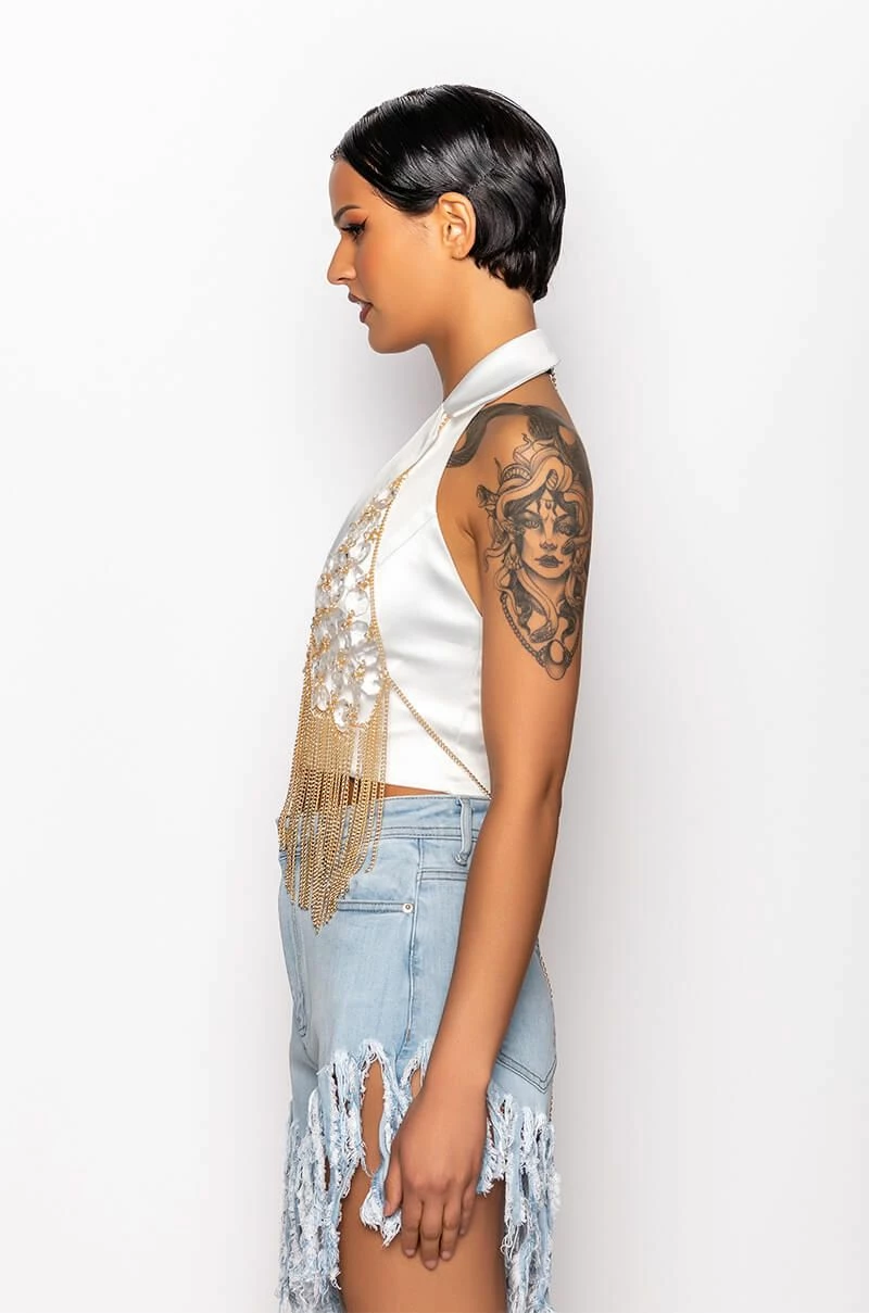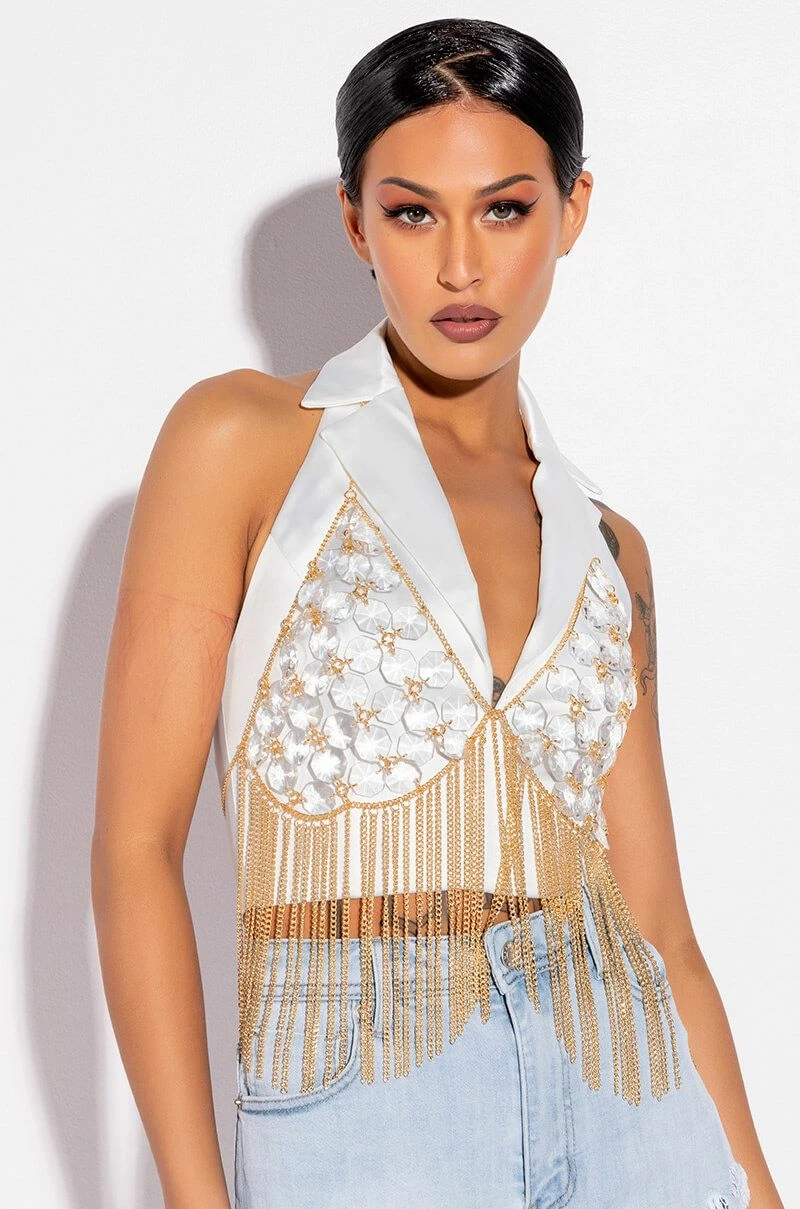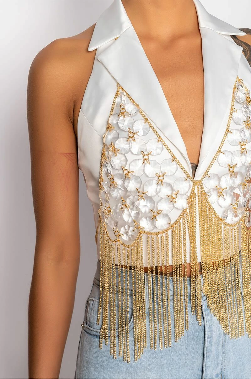 Unleash the dancer within in The AKIRA Label Fantasy Drip Link Bra Body Chain! This performance-worthy piece features a bralette silhouette, clear acrylic stones, a faux gold chain link base, a halter neck design, back chain link fastening, and fringe chain detailing. Complete with dual lobster claw closures. Style this piece over a sleek bodysuit or strapless dress to add some glam shimmer to your look.