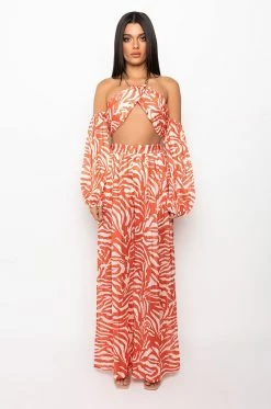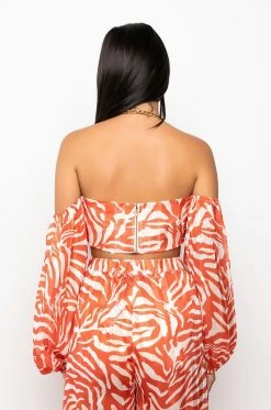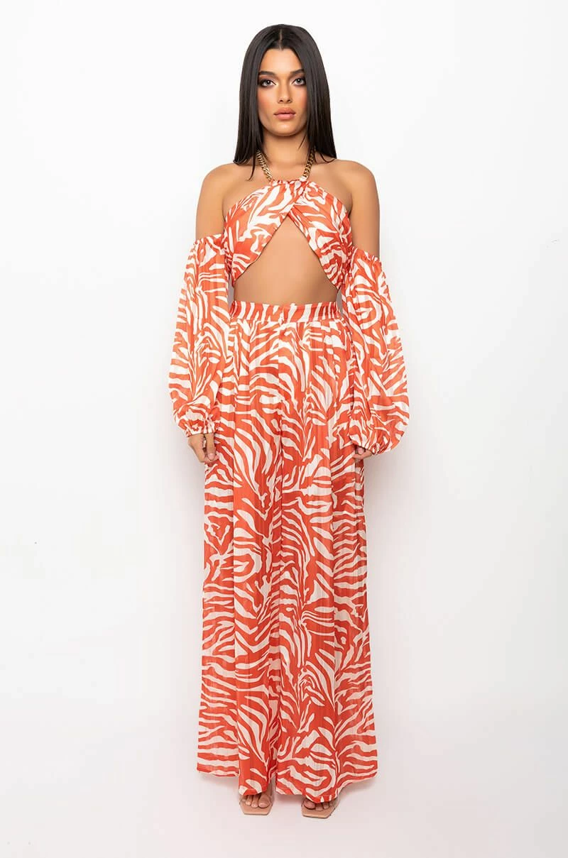The AKIRA Label Feeling Good Living Better Chain Halter Crop Top features a cropped cut, off the shoulder long sleeves, animal print patterning, and chain link halter style neckline with latch back clasp. Complete with a cross front underbust design, exposed back zipper closure, and lined chiffon base. Finish the look with the coordinating AKIRA Label Feeling Good Living Better Palazzo Pant.