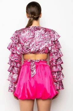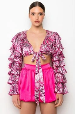 The AKIRA Label Feeling Groovy Tie Front Ruffle Sleeve Blouse is made from a satiny fabrication and features a multicolor paisley pattern, a plunging neckline, tie front design, long bell sleeves with layered ruffle detailing, polyester lining, a thin elastic back band, and a cropped cut. Pair this piece with flared bottoms and booties for a festival-worthy look!