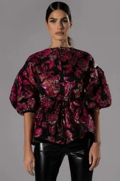 The AKIRA Label Field Of Roses Brocade Blouse is made from a metallic, floral-embossed brocade fabrication and features a high, rounded neckline, long, billowing sleeves, a drawstring waist, slick polyester lining, and a peplum hem. Complete with button down front closures.