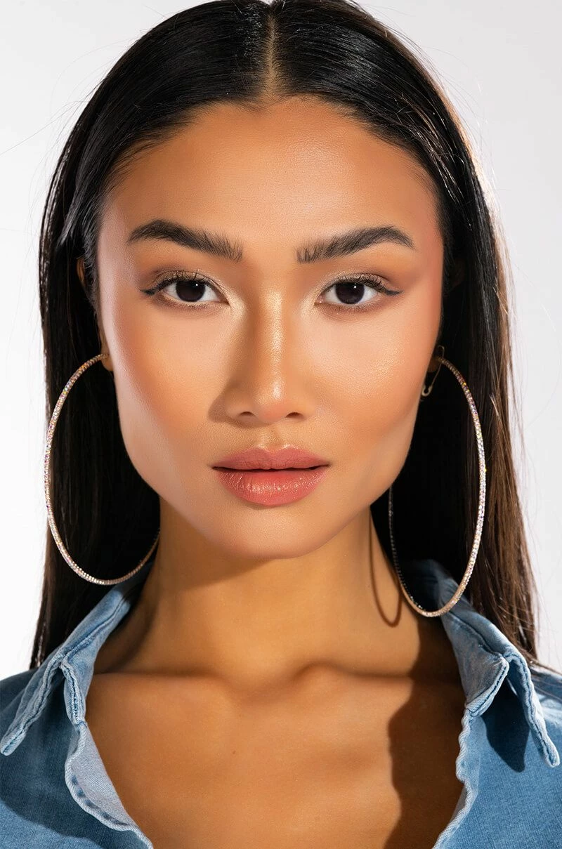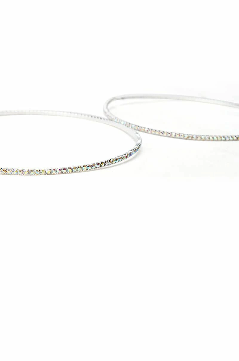The AKIRA Label AB 80MM Rhinestone Hoops are a slender 80mm silver metallic hoop earring featuring AB rhinestone detailing and a classic post back fastening. Perfect size for adding sparkle to any ensemble!
