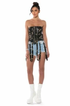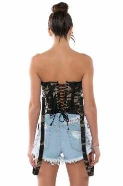 Stay drippin’ in The AKIRA Label Finesse Baddie Corset! This sexy piece is made from a structured fabrication and features a bold camo print, a strapless design, boning for structure, metal D-ring detailing, strappy garters at the hem, a lace-up front, and an exposed zipper back closure. Layer this piece over sweatshirts and combat boots to add some fierce edge to your look.