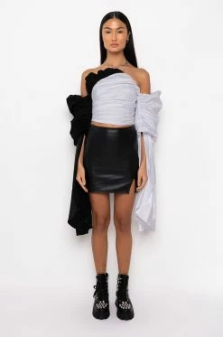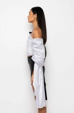 Make it count! The AKIRA Label First Impression Cascading Sleeves Off The Shoulder Blouse is made from a classic cotton fabrication, and is complete with a cropped length, off the shoulder exaggerated long sleeves with a long satiny trim, shirred back detailing, and a back zipper closure.