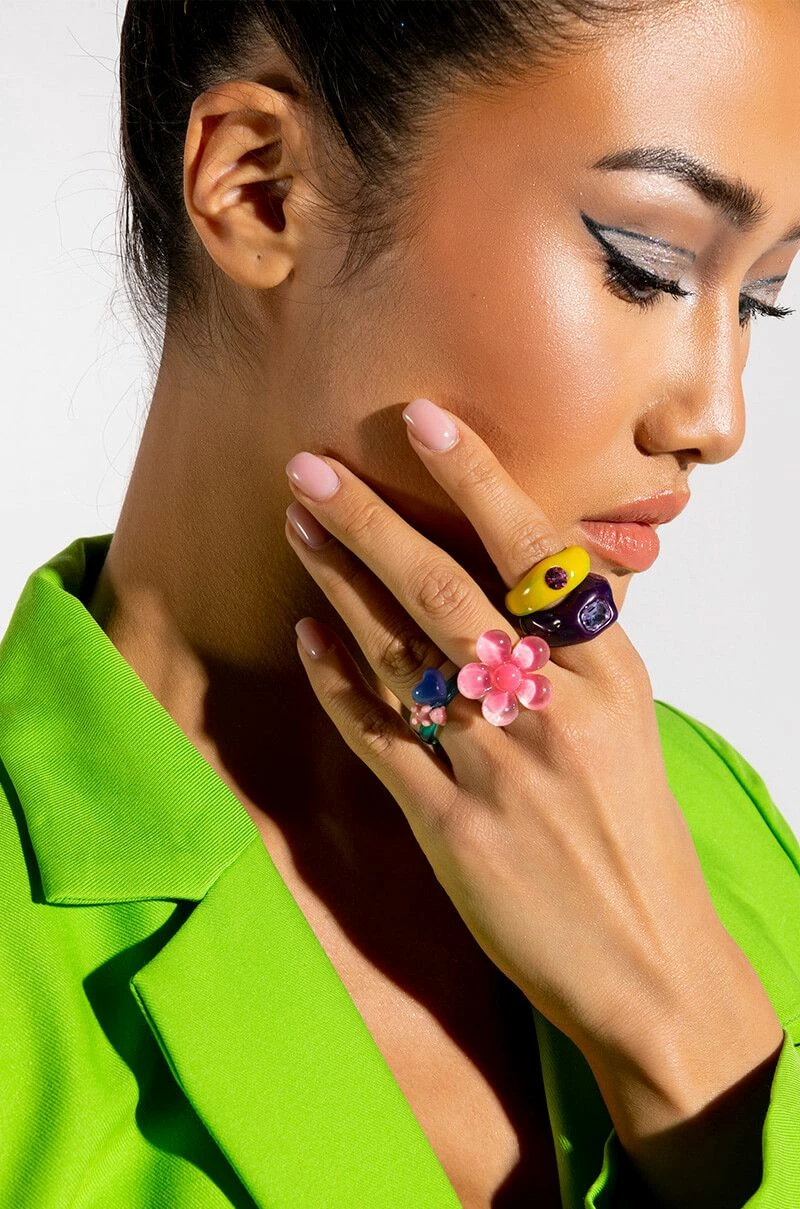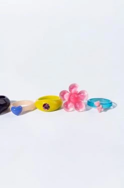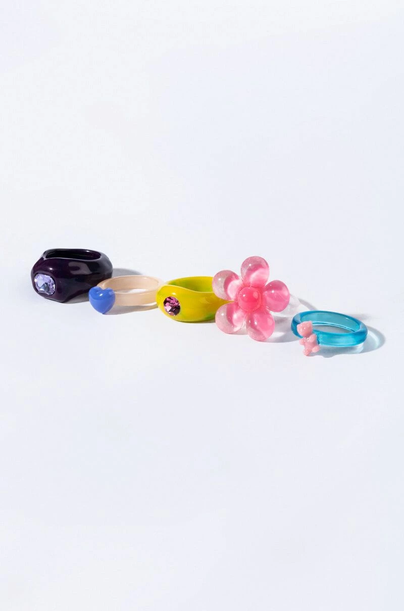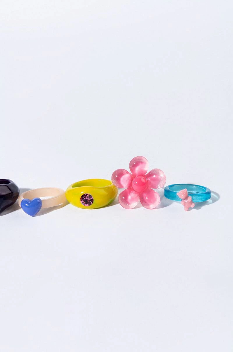 The AKIRA Label Flower Power Candyland Ring Set is a collection of five individual resin rings with whimsical charms and gem accents. Wear them separately or together to add some unique color and texture to your look!