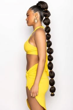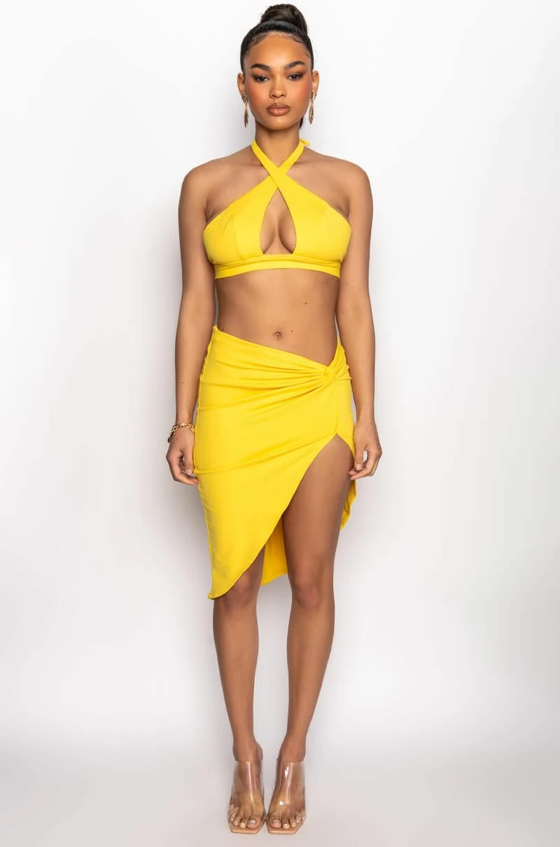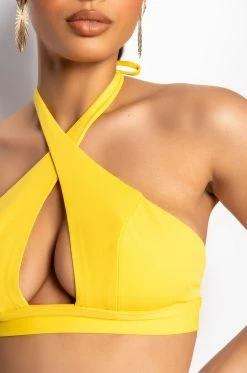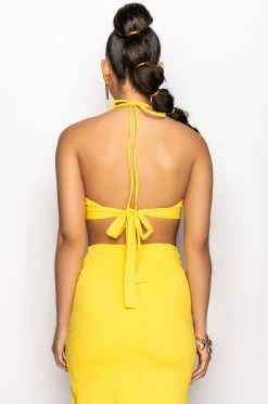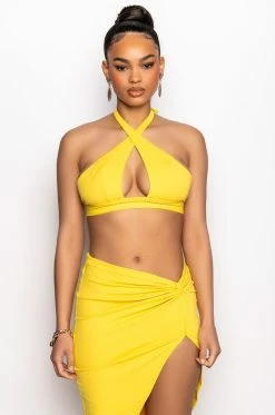 Stay fly in The AKIRA Label Fly Gal Cutout Halter Crop Top. This bra-like piece features a smooth and stretchy fabrication, a tie back halter design, an ultra-cropped cut, and a tie back waist with open back. Pair this top with the AKIRA Label Fly Gal Wrap Mini Skirt.