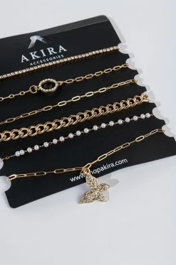 The AKIRA Label Flyest Bracelet Set features six separate gold chain pieces: one features a pave butterfly charm. Includes one pearl beaded bracelet, one chain link piece with a pave o-ring accent, one rhinestone link piece, and two chain bracelets of varying styles. Each complete with adjustable lobster claw fastenings.