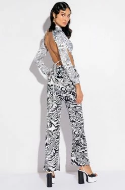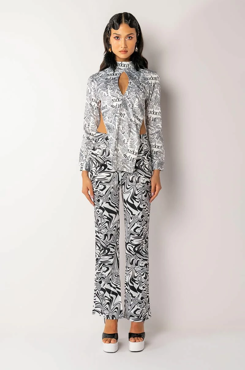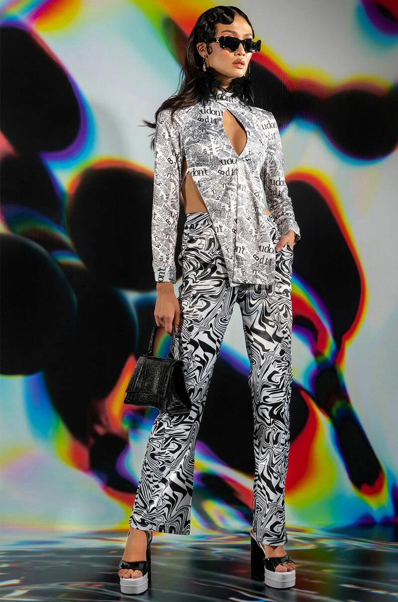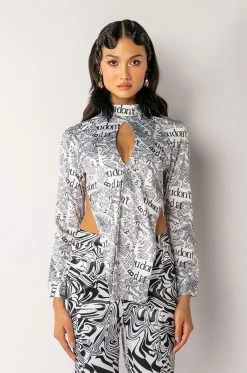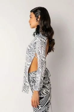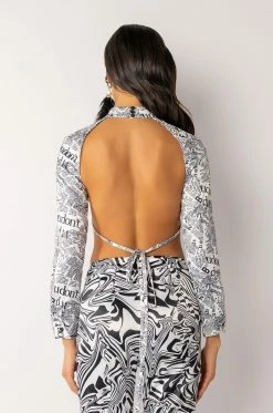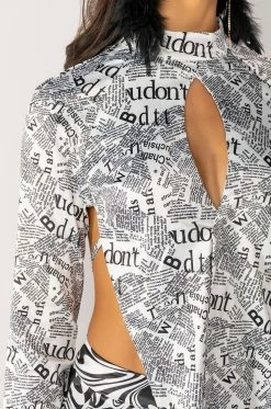 Extra, extra, read all about it! The AKIRA Label Front Page News Open Back Long Sleeve Mock Neck Satin Blouse is made from a lightweight satin fabrication and features a scattered newspaper clippings print, a button back mock neckline, long sleeves with button wrist details, a sexy front keyhole cutout, a split hem, and an open back with tie waist detail.