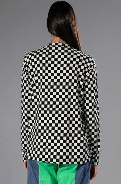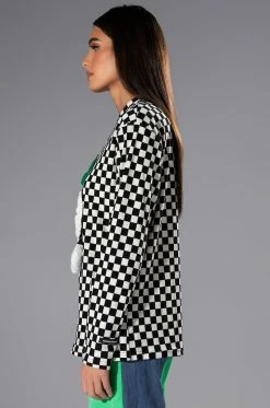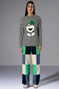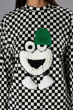 Get the party started with the AKIRA Label Fun Times Checkered Top! This cutesy piece is made from a soft, stretchy ribbed knit fabrication and features a graphic checkered print, a mock neckline, long sleeves, a boxy fit, and a centered 3D patch character with a ribbed knit beanie and textured sock booties. Pair this piece with wide leg cargo bottoms and chunky sneakers to complete your look.