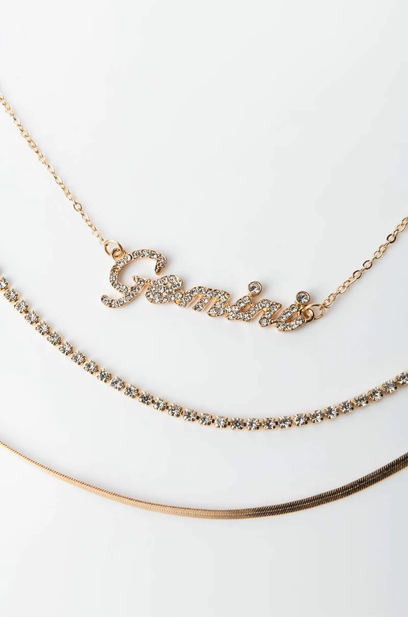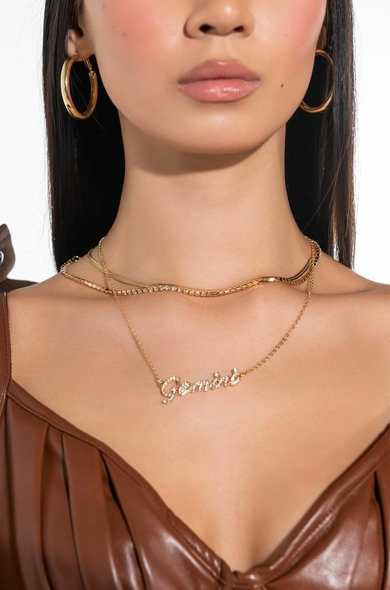 Dainty jewelry with a personal touch, what’s not to love? The AKIRA Label Gemini Layer Necklace is a faux gold layered necklace featuring a triple chain link design, rhinestone-embellished “Gemini” script charm, and lobster claw clasp.