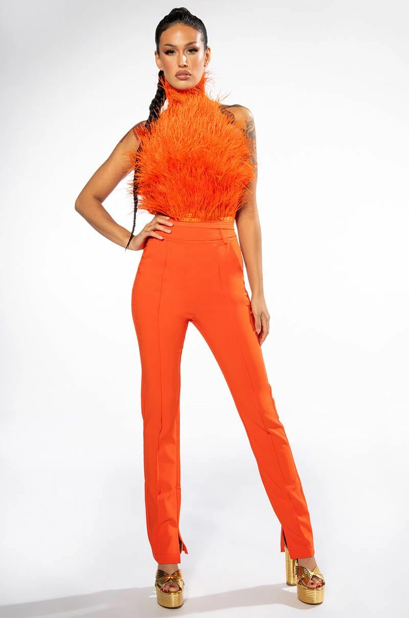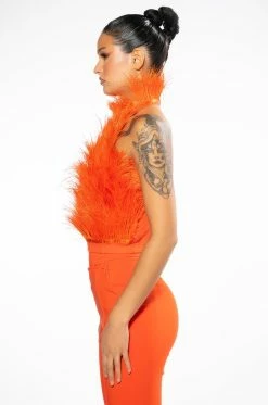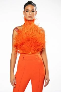 The AKIRA Label Genuine Ostrich Feather Sleeveless Cropped Halter Blouse in Orange is made from a stretchy mesh fabrication and features layered opulent ostrich feathers throughout, a halter neckline with back button detailing, a sleeveless silhouette, an elastic hem, a sexy open back, and a cropped length. Complete with an exposed back zipper closure. Pair this piece with satin bottoms and pumps to complete your look.