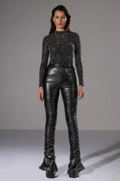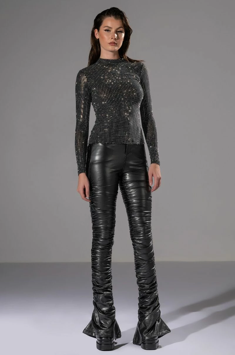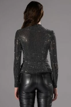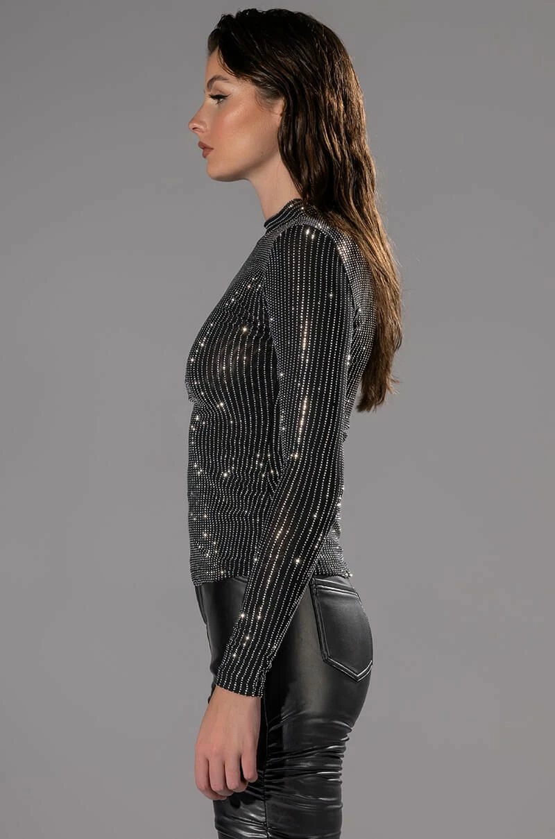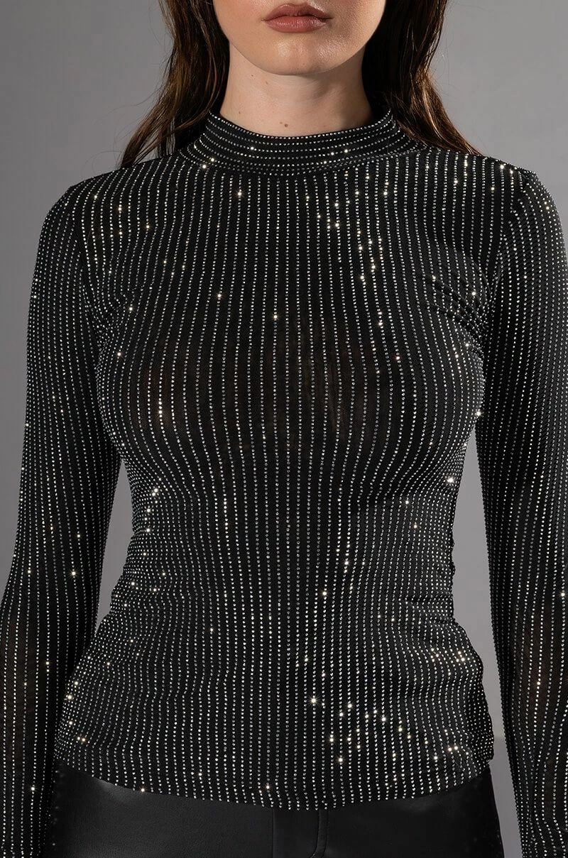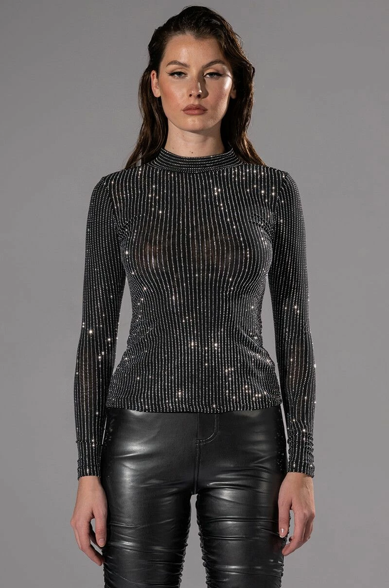 Stand out and shine on in The AKIRA Label Glitz Long Sleeve Mesh Top. This sheer, long sleeve mock neck top features a waist length silhouette, rhinestone pinstripe detailing, and long sleeves. Pair with a bralette, pleather pants, and a moto jacket.