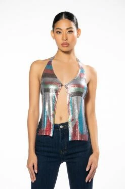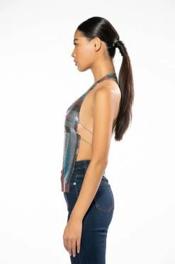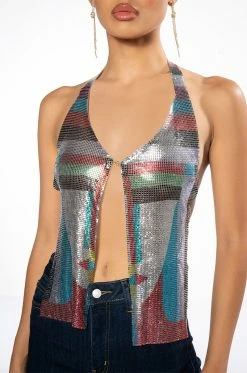 The AKIRA Label Going Out Tonight High Shine Chainmail Front Clasp Halter Top is made from a flexible chainmail base and features a multicolor geometric print, a halter with an adjustable lobster claw chain, a plunging neckline with a front clasp closure, a split hem, and a cropped silhouette. Complete with dual adjustable lobster claw chain link back closures.