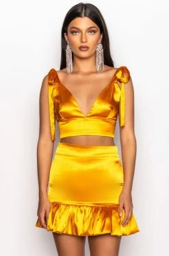 Catch the sun in The AKIRA Label Golden Hour Tie Sleeve Crop Top! This sweet top is made from a satin fabrication and is complete with tie tank straps, a deep cut neckline, seamed cups, a thick waistband, cropped silhouette, and an exposed back zipper closure. Style this top with the matching AKIRA Label Golden Hour Bubble Mini Skirt to complete your flirty fun look.