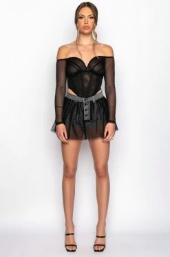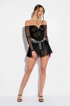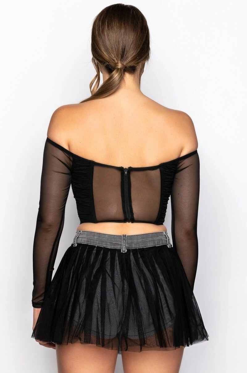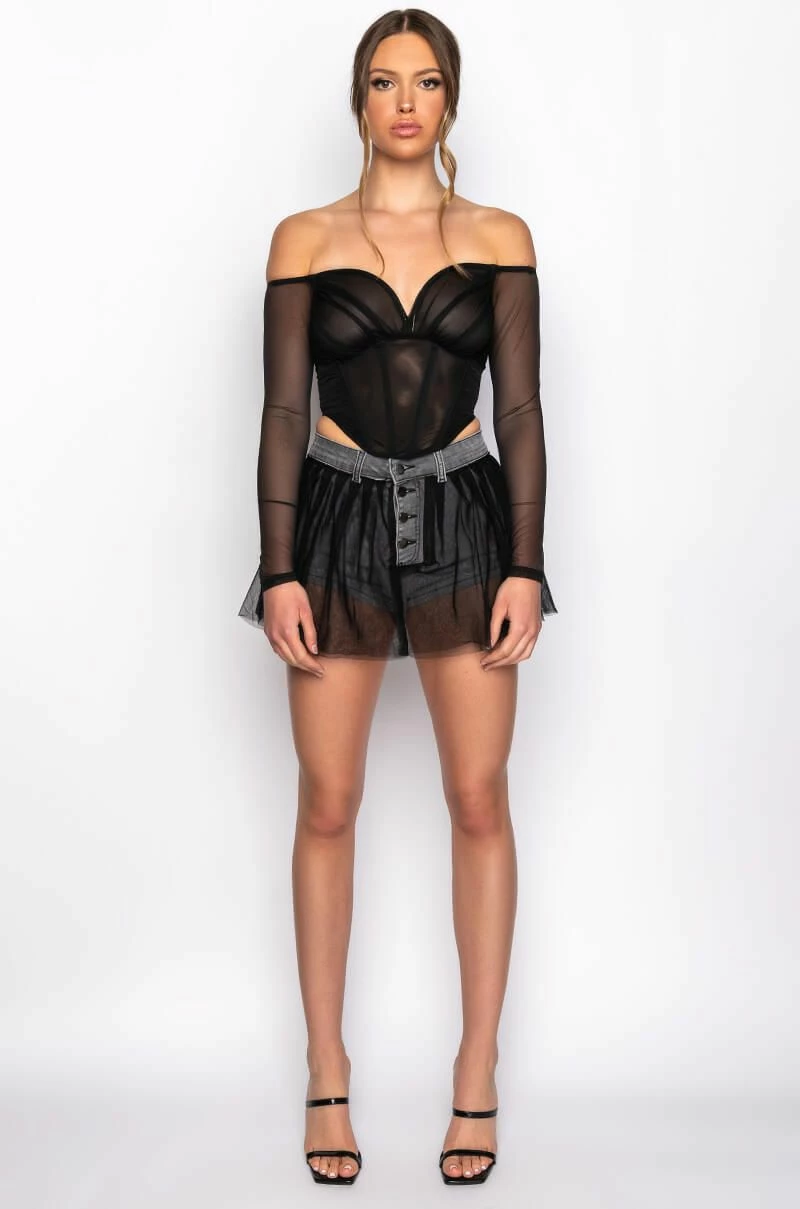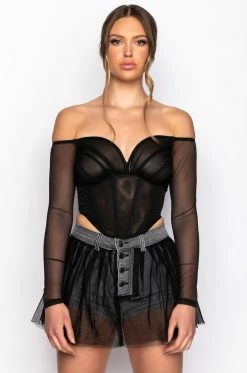 The AKIRA Label Good 4 U Long Sleeve Mesh Bustier is made from a sheer mesh fabrication, and is complete with wired v neckline, corset boning for structure, long sleeves, and a back zipper closure.