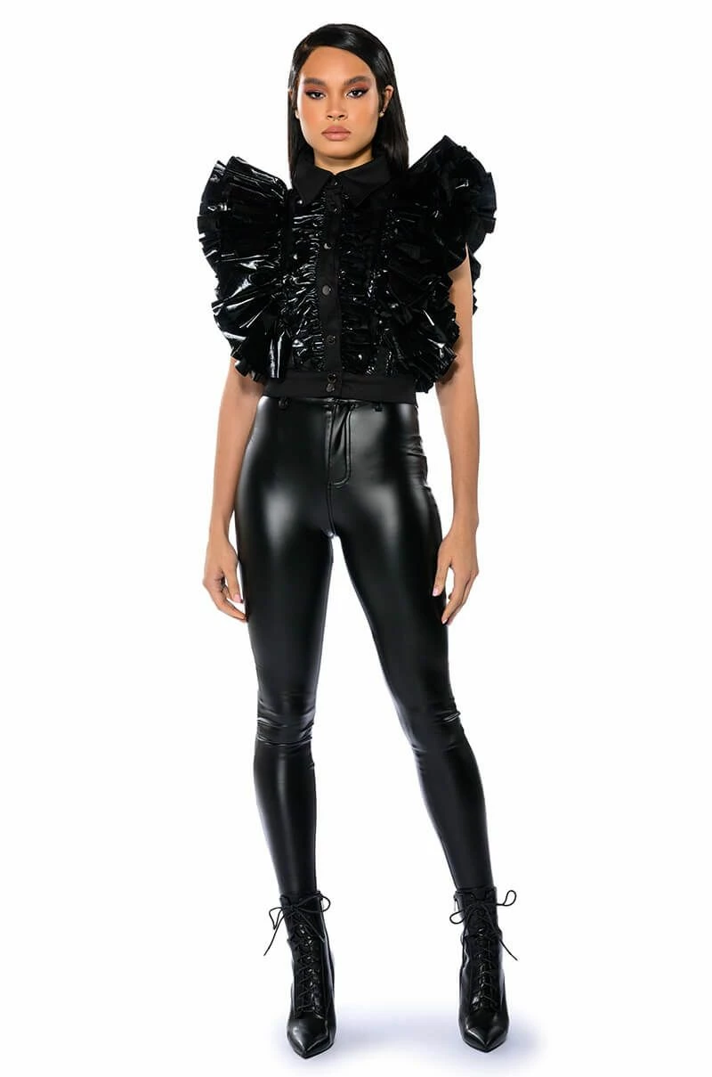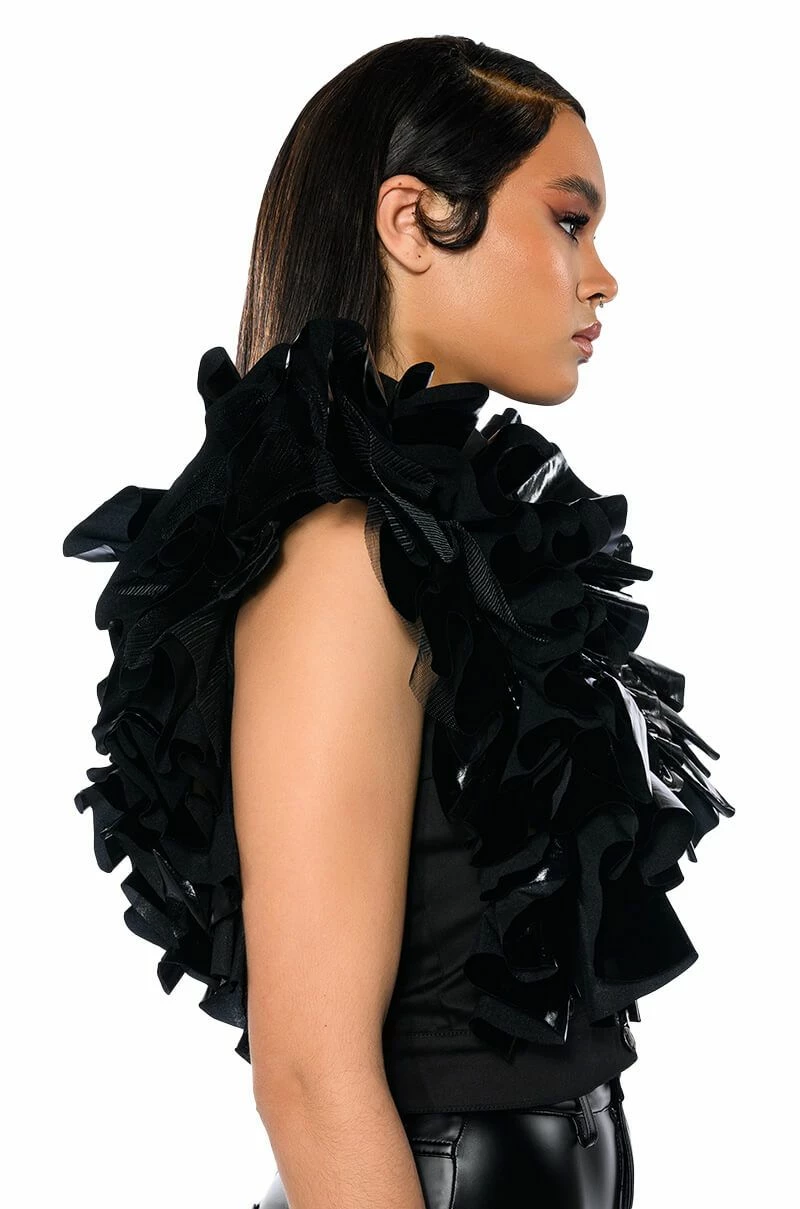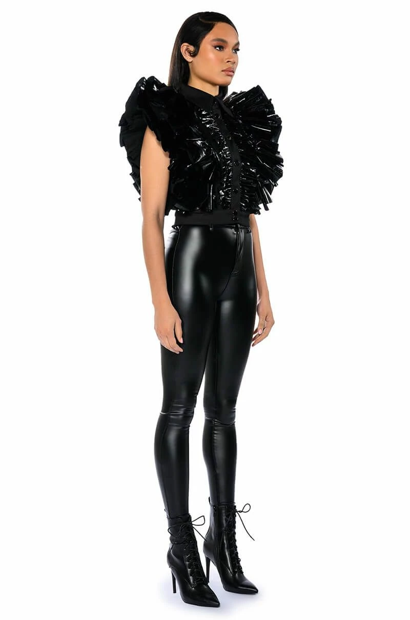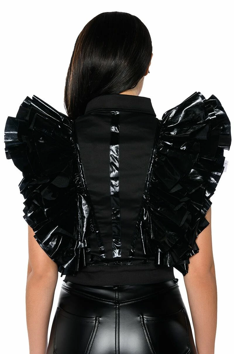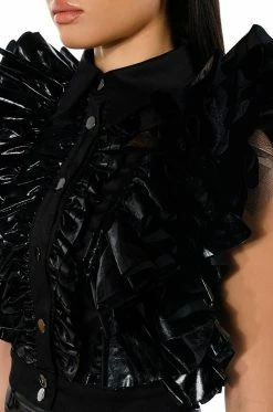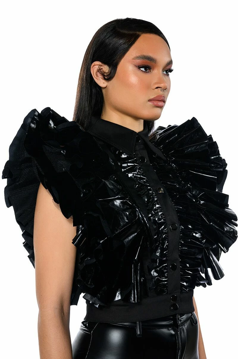 The AKIRA Label Greatest Show Ruffle Button Down Blouse is made from a structured cotton fabrication and features a collared neckline, glossy ruffle body detailing, dramatic ruffle cap sleeves, a slightly cropped silhouette, and snap button down front closures. Pair this piece with skinny pant boots and gloves to complete your show stopping look.