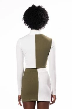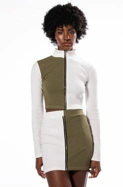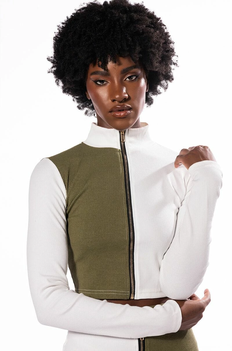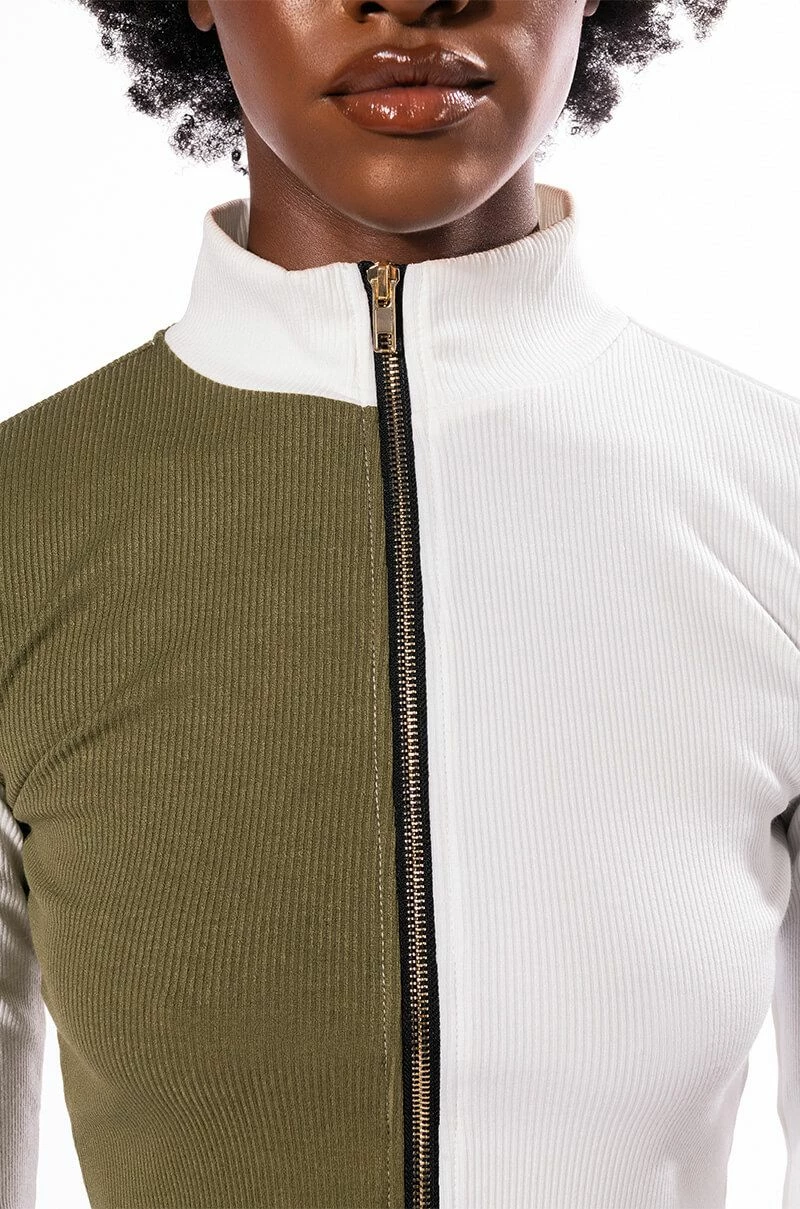 Sweet as cream, The AKIRA Label Half N Half Zipper Top is made from a soft ribbed knit fabrication and features a mock neckline, long sleeves, a colorblock panel, a cropped silhouette, and a front zipper closure. Pair this piece with the coordinating AKIRA Label Half N Half Zipper Skirt and booties to complete your look.
