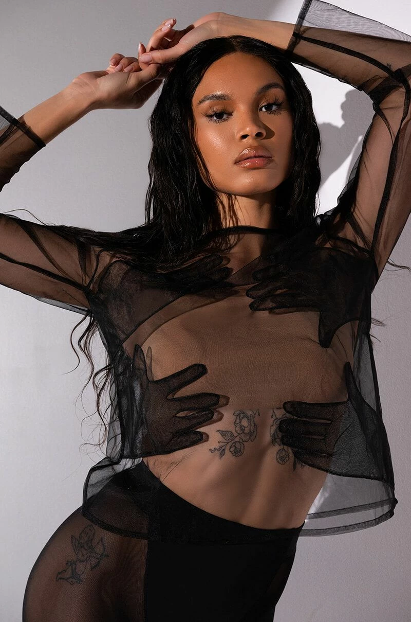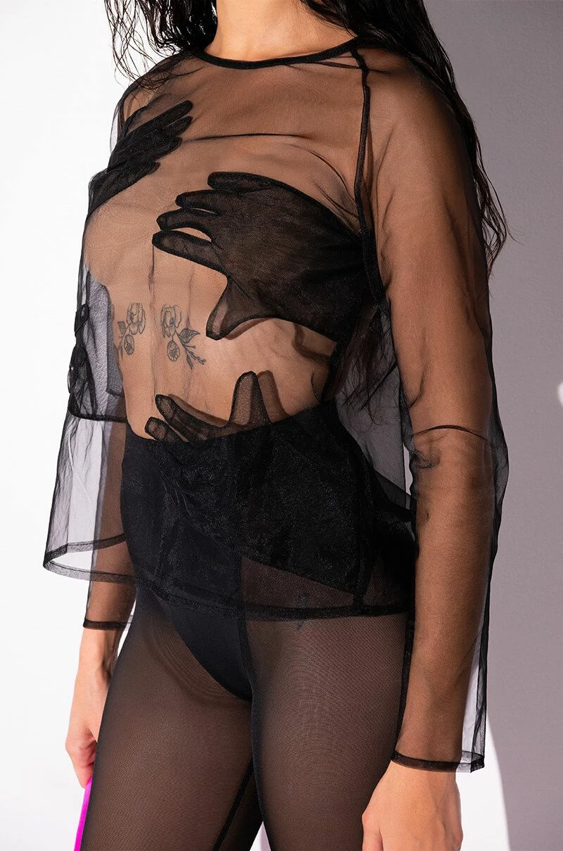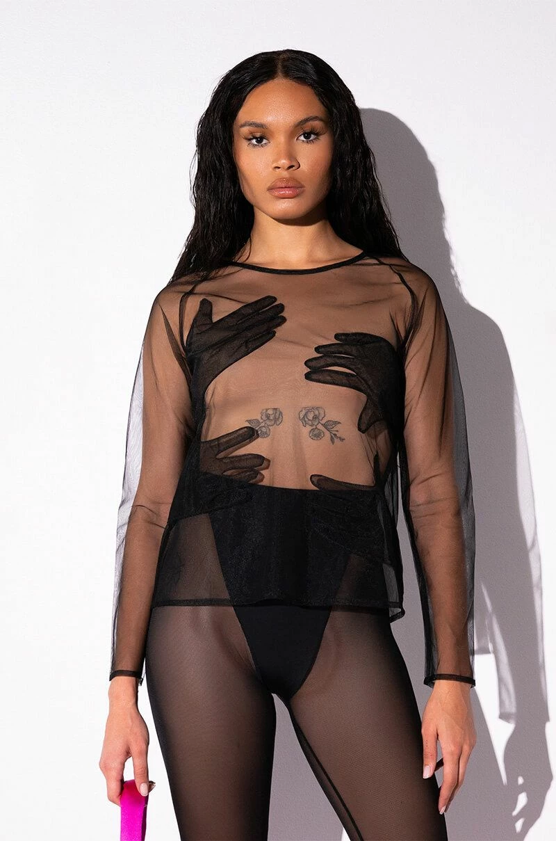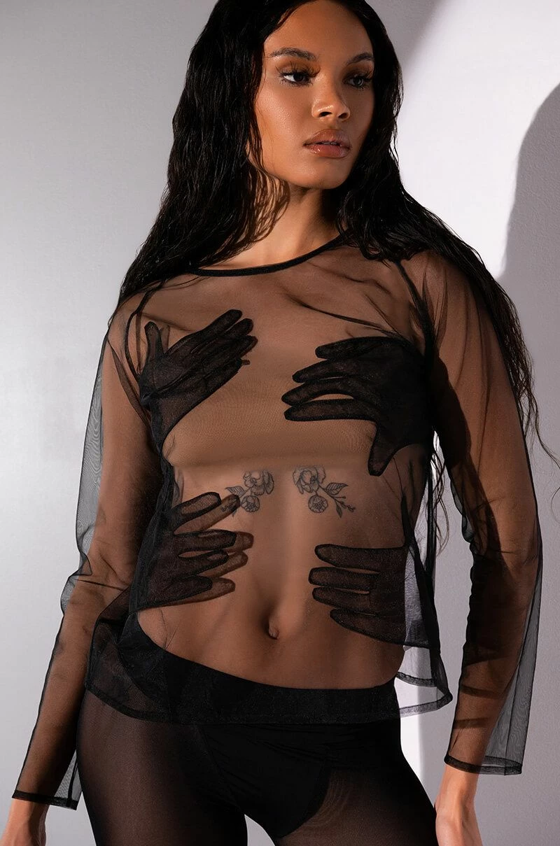 The AKIRA Label Hands On Me Mesh Top is a sheer mesh piece featuring a scoop neckline, long sleeves, a pull on fit, and four hand appliques. Pair this piece with a cute bra top and leather look leggings.