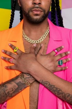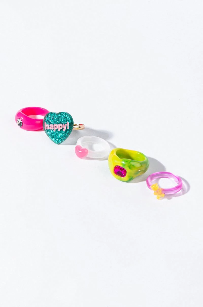 The AKIRA Label Happy! Candyland Ring Set includes five individual resin rings with gems and cutesy charms. Included is an adjustable ring with a glittery heart that says “happy!” on it. Wear these rings separately or style them together to add some unique color and Y2K vibes to your look!