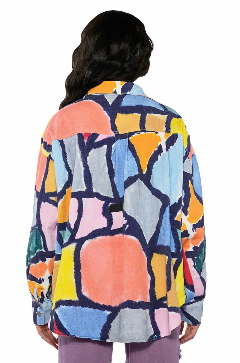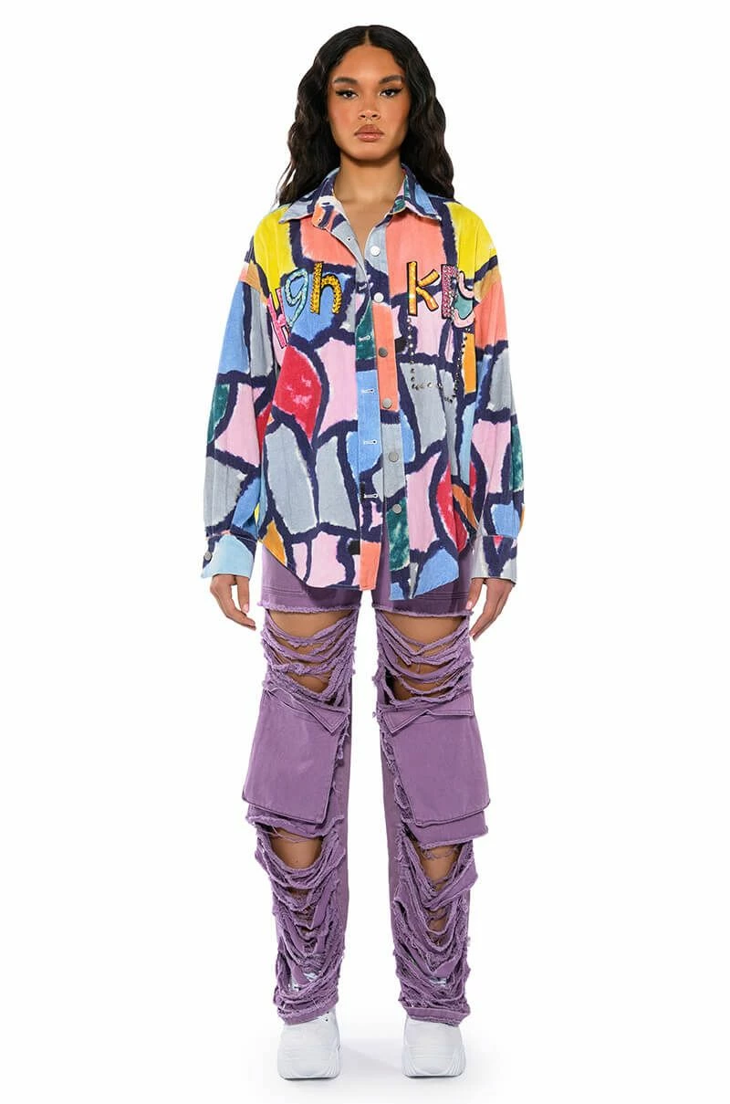 The AKIRA Label High Key Abstract Button Down Blouse is made from a structured, lightweight fabrication with an all over colorful and bold abstract design. This piece features a pointed collar, long sleeves with buttoned cuffs, and a graphic print of ‘High Key’, embellished with beads, rhinestones, and sequins. Complete with a longline silhouette, an oversized design, rounded hems, and a button down front closure. Pair this bold top with pleather pants and booties for that wow effect!