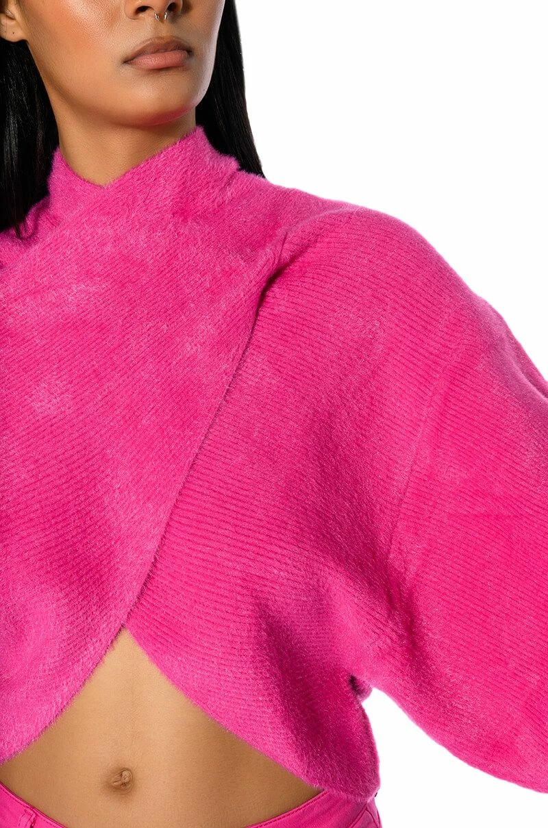 The perfect seasonal sweater is here, The AKIRA Label Honey Cross Front Fuzzy Sweater! This cozy piece is made with a stretch knit base fabrication, and features an all over soft and fuzzy design. Complete with a cross front detail, mock neck, long sleeves with ribbed knit hems, and a tulip bottom hemline. Pair with pleather pants and pumps for a weekday night out!
