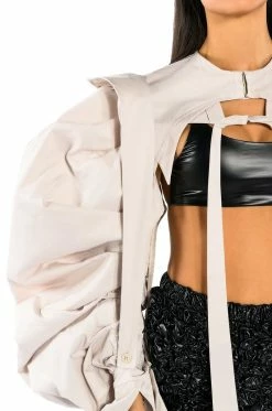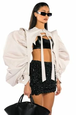 The AKIRA Label I Do It On The Daily Drama Sleeve Bolero is made from a structured, cotton blend base fabric and features a a crew neckline, dramatic puffed shoulders and long sleeves, a connected buttoned strap from shoulder to sleeve cuff, and sleeve cuffs with splits. Complete with an ultra cropped silhouette, hook-and-eye front closures, and dangling center straps. Finish off your everyday extravaganza with a high-waisted midi skirt and booties.