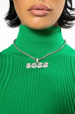 The AKIRA Label I’m A Boss Bish Icy Necklace is made from a faux silver metal base and features a rhinestone link chain with a pave rhinestone “BOSS” text pendant. Complete with a fold-over clasp closure.