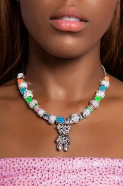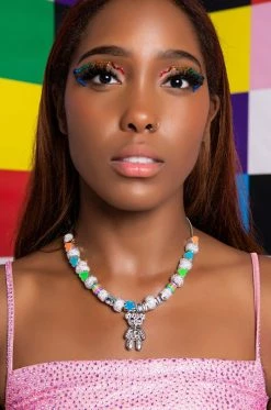 The AKIRA Label I Want Candy Rhinestone Enamel Charm Necklace is a Y2K-inspired piece featuring a silver snake chain link base, rhinestone, heart, flower, and colorful enamel charms, a rhinestone-embellished, movable 3D teddy bear pendant, and an adjustable lobster claw closure finished off with a small silver heart charm.