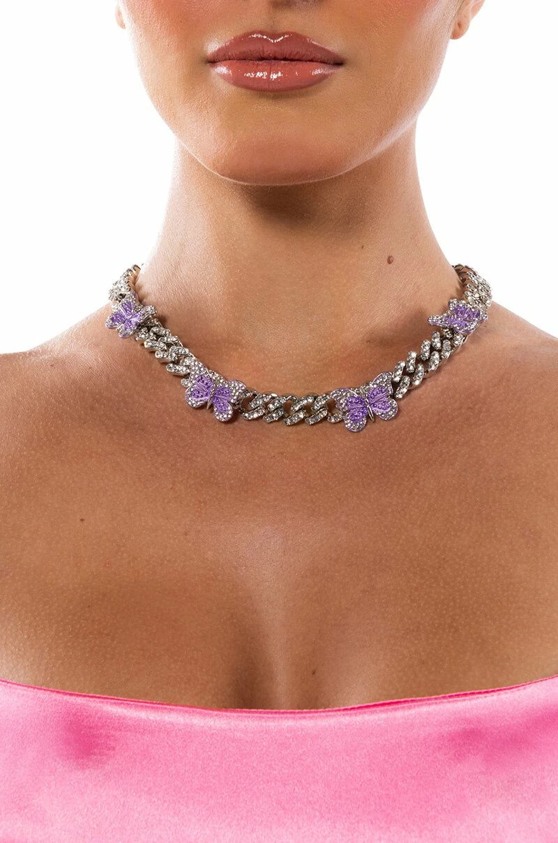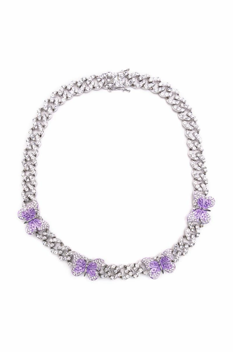 The AKIRA Label Iced Out Rhinestone Butterfly Chain Necklace is made from a faux silver metal and features a pave curb chain link base with rhinestone-embellished metal butterfly charms. Complete with a buckle closure.
