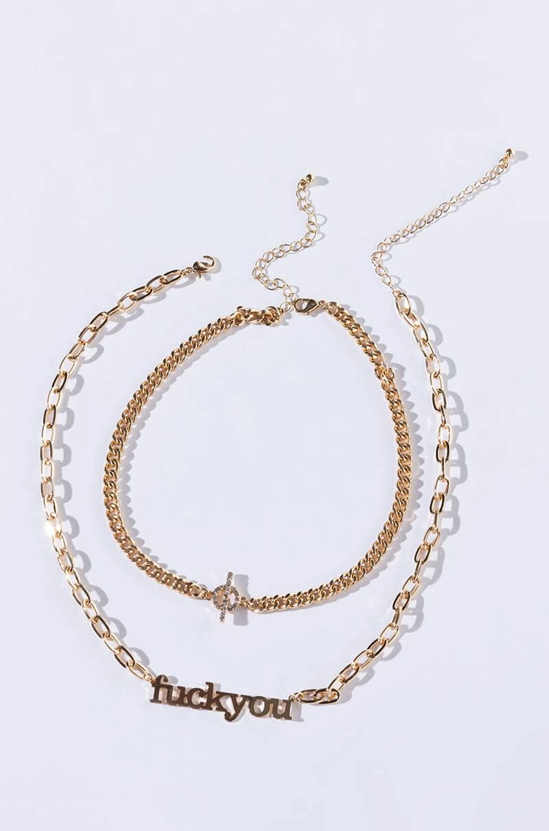 The AKIRA Label IDFWU Necklace Set is a pair of faux gold necklaces featuring two chain link chokers: one with a rhinestone-embellished toggle pendant, the other featuring a “fuck you,” letterset pendant. Both complete with lobster claw clasps.